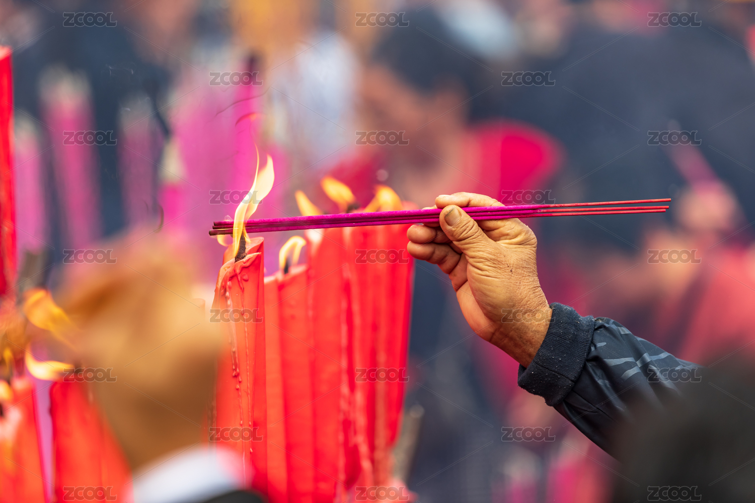 靠近燃烧的蜡烛点燃香火特写