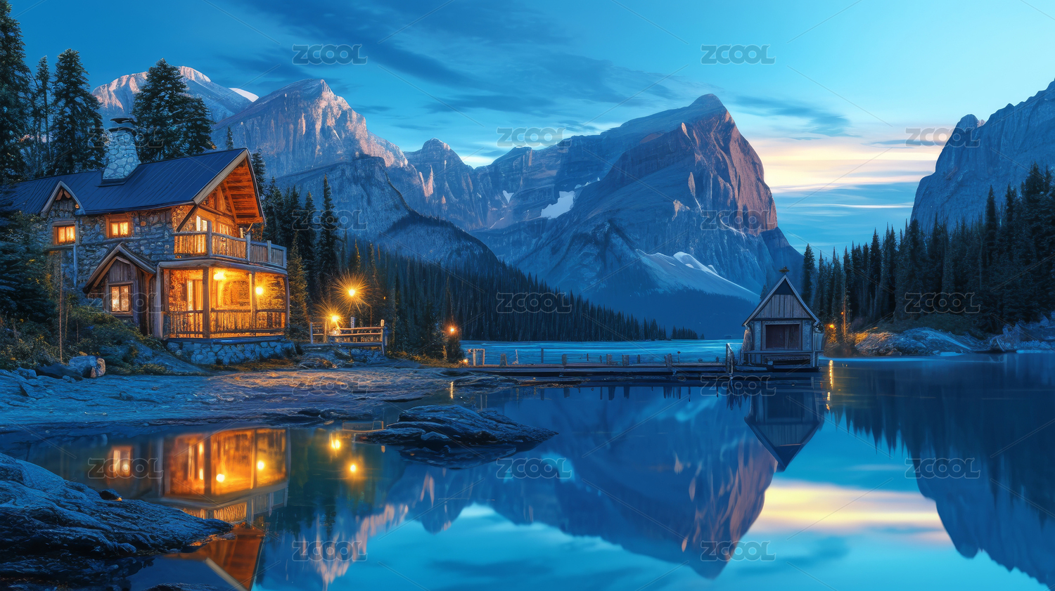 湖畔小屋的静谧之夜 山间小屋的温馨灯火