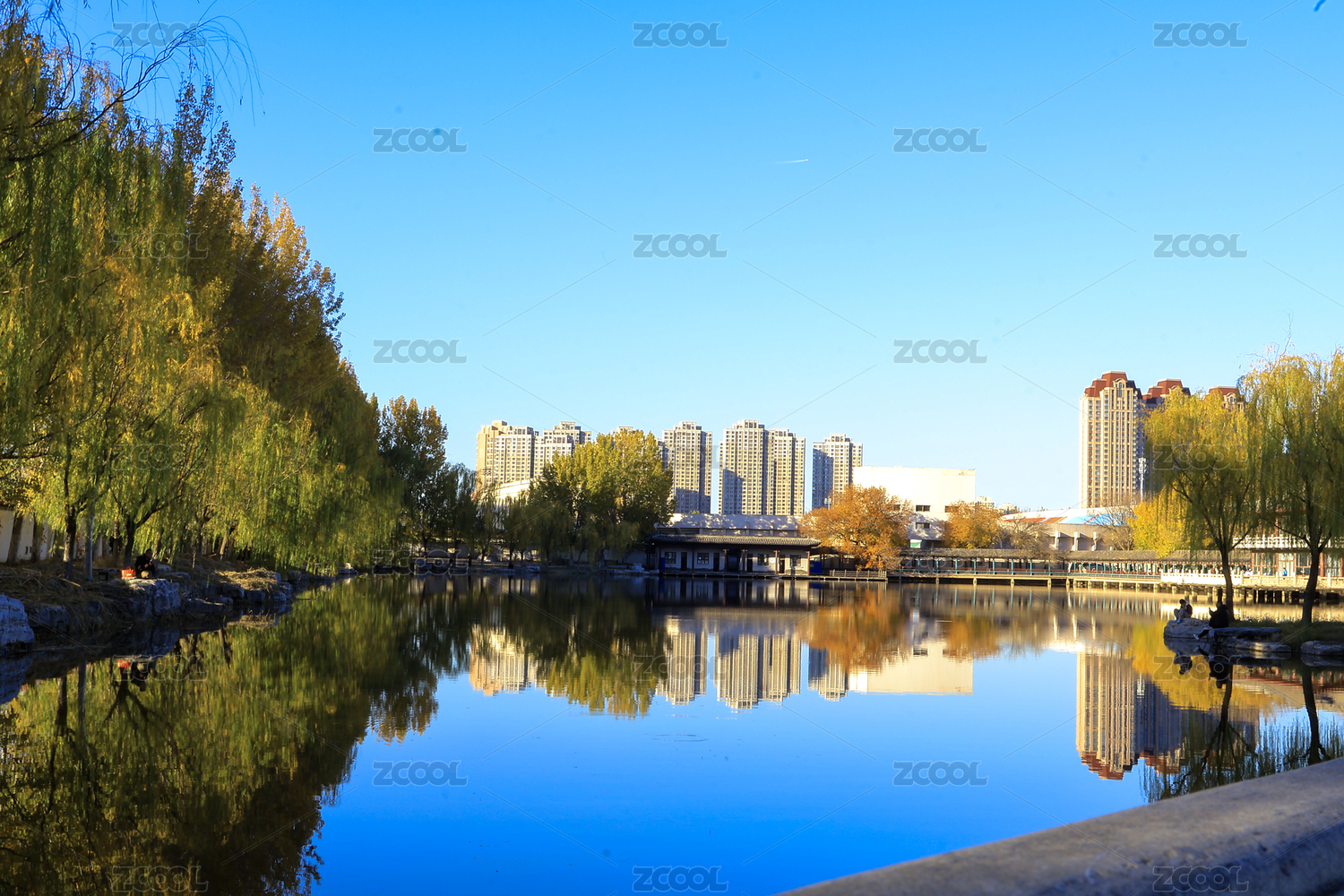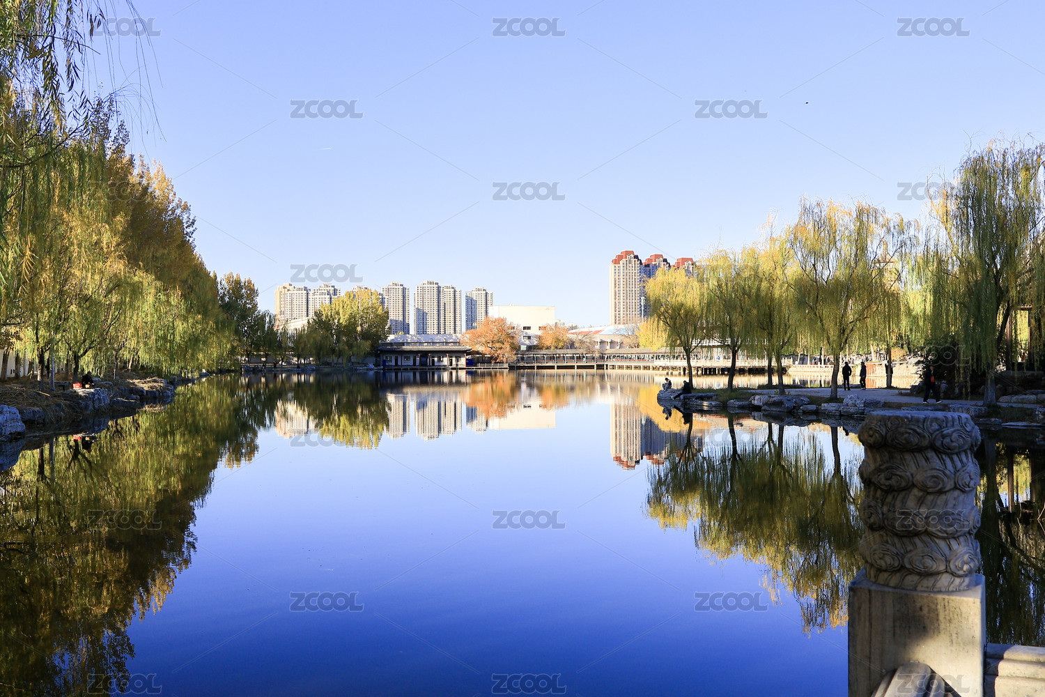 中国天津北宁公园湖泊与建筑倒影及石雕景观