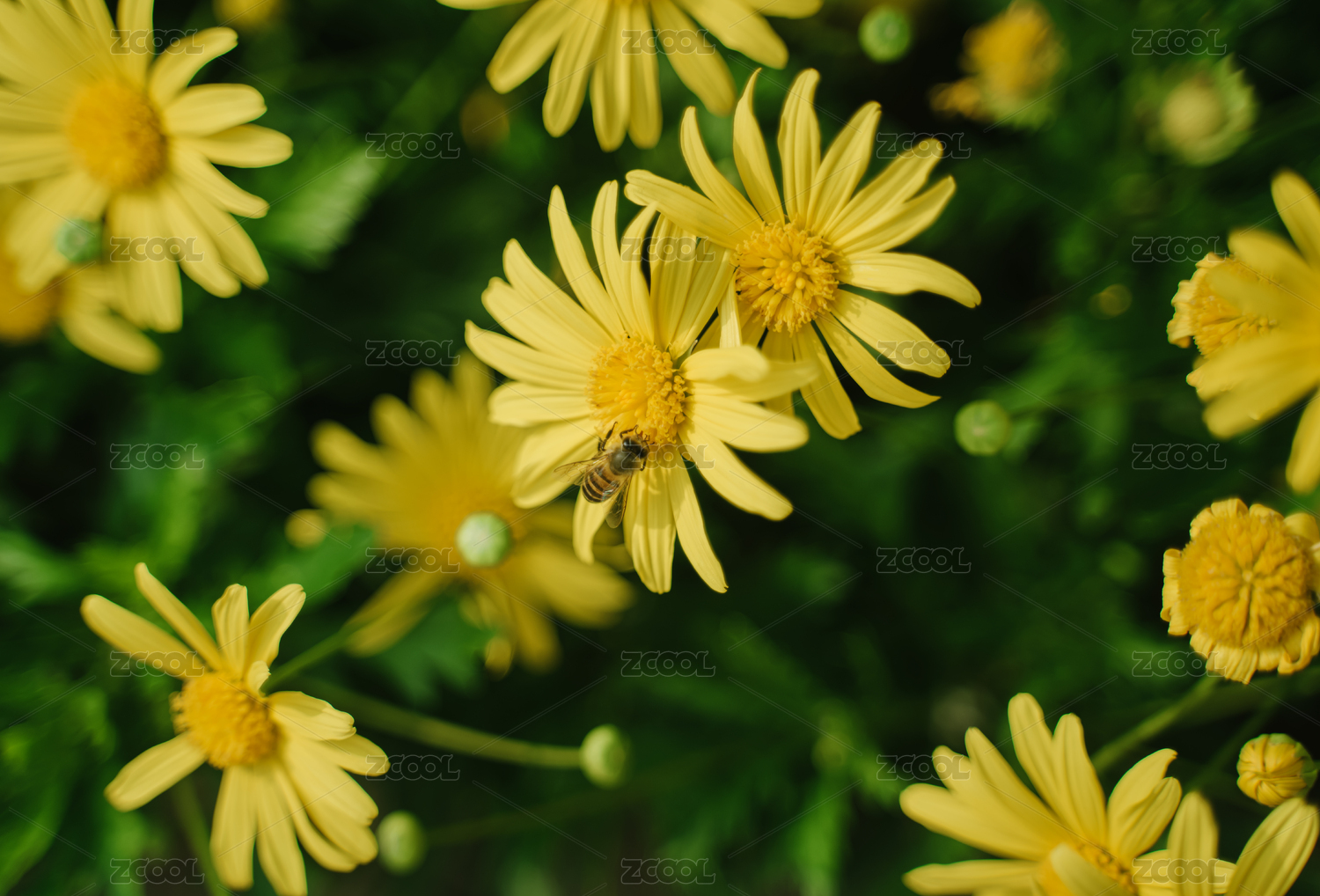 花园中一角橘黄色的花盛开着蜜蜂在采蜜