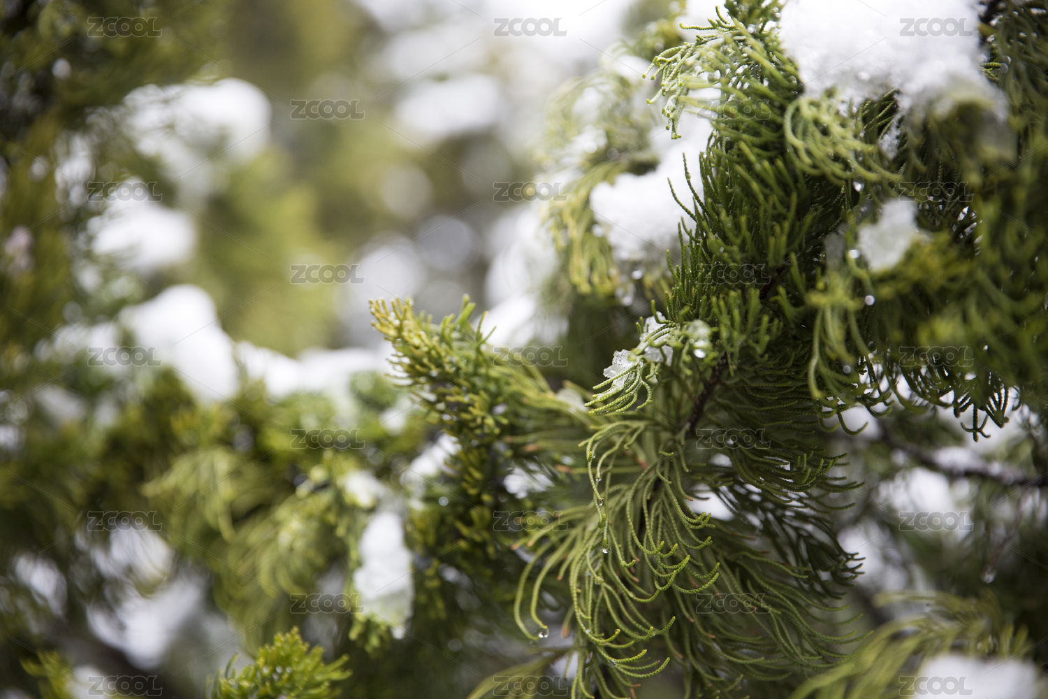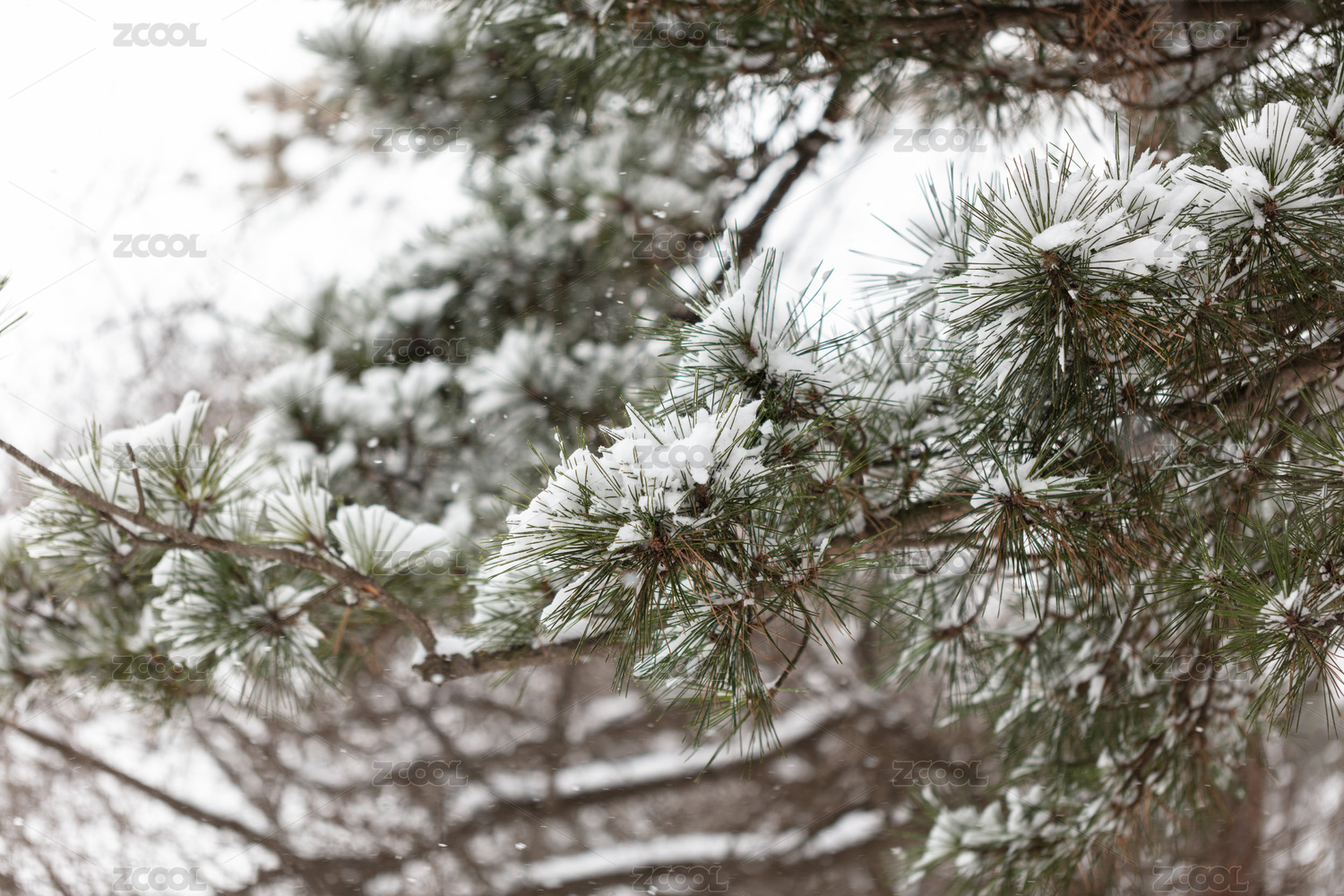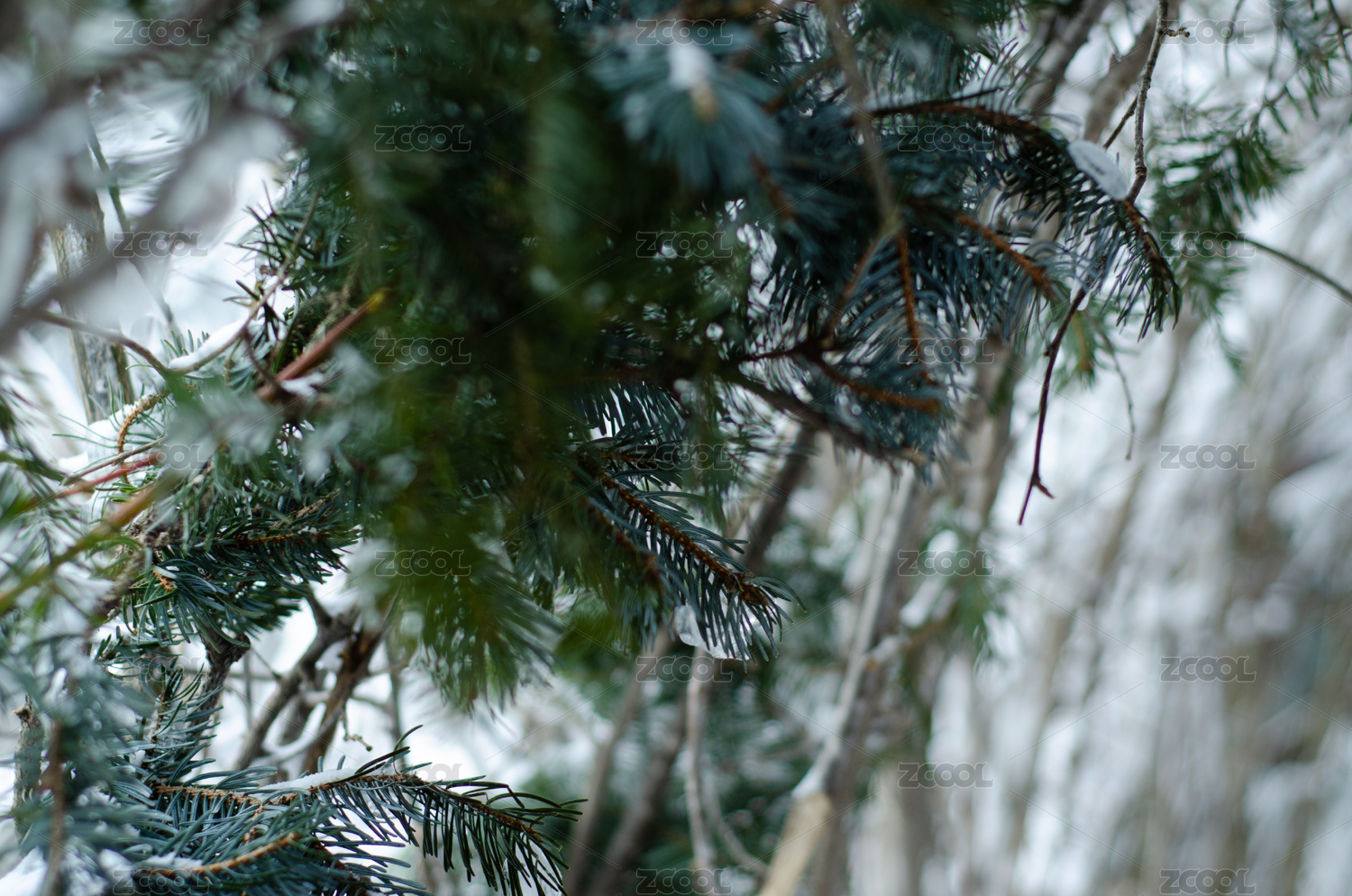 冬季下雪天树林中植物的枝叶上积满了厚厚雪