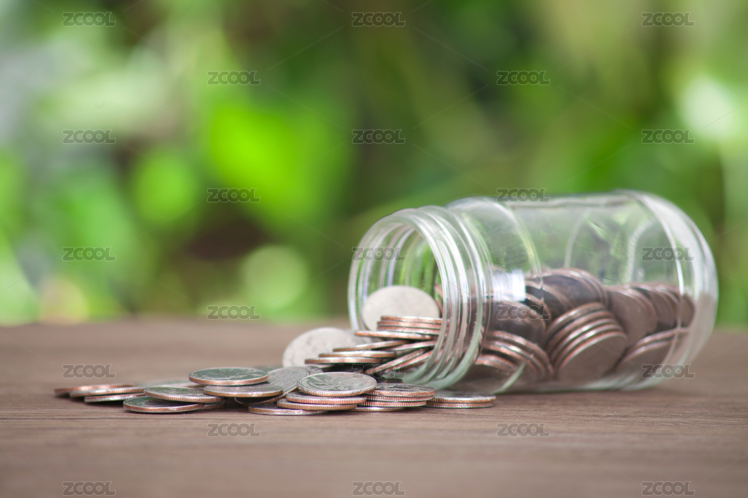 储蓄概念图像。 玻璃瓶中的硬币和自然背景