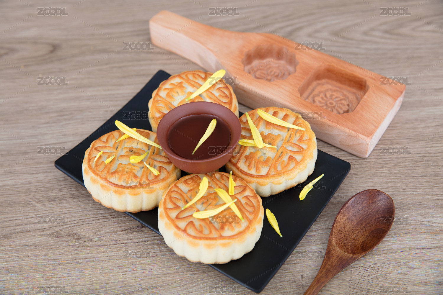 一盘中秋的月饼和一碗茶及木质月饼模具和木勺