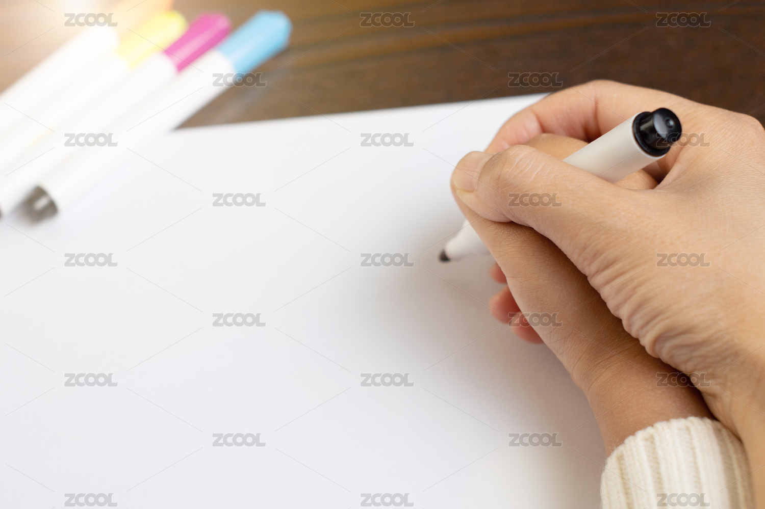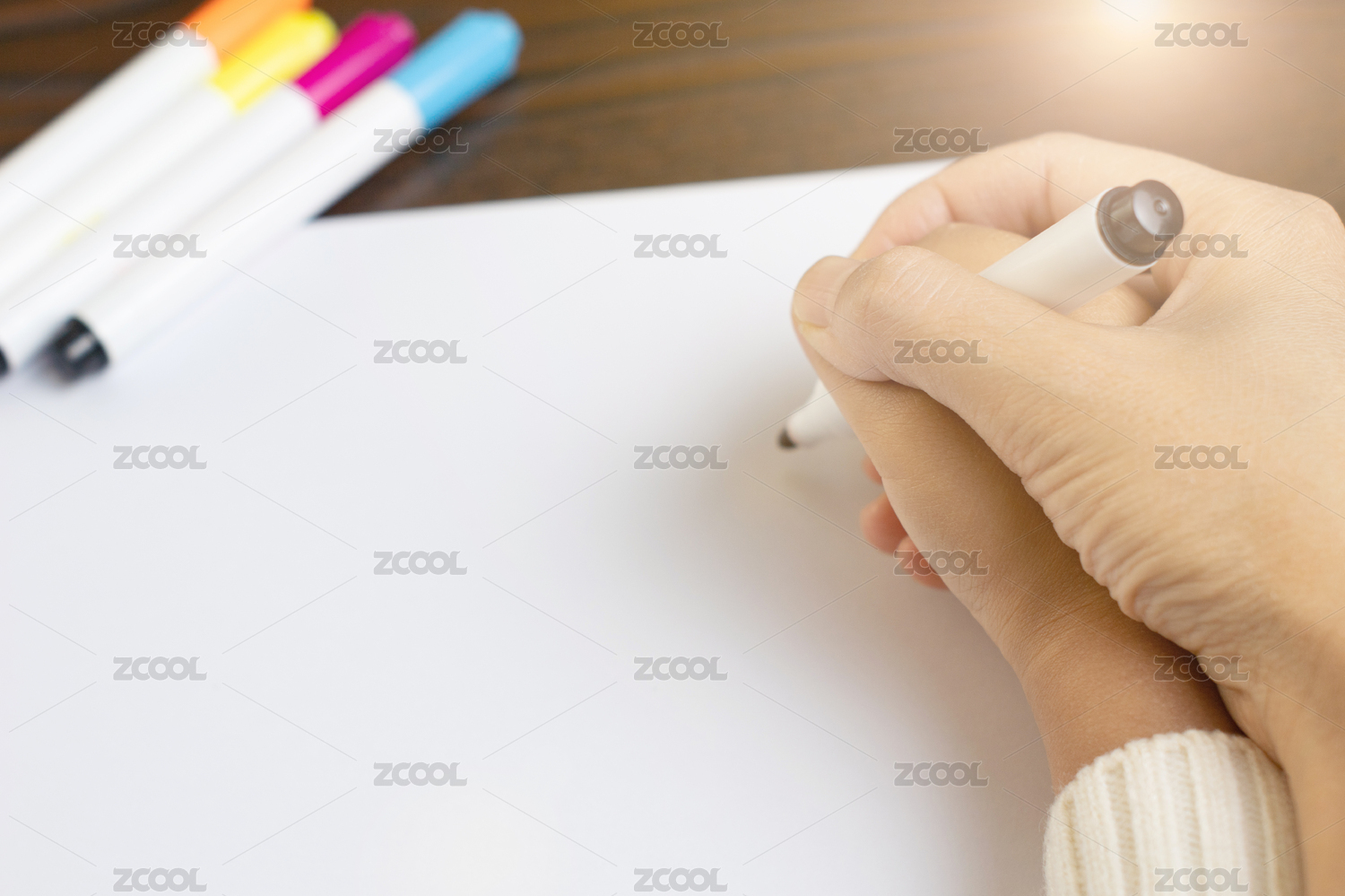 年轻的混血中国亚洲女子用绿颜色的铅笔画写生生产办公工作室。职业和职务侵占的概念。