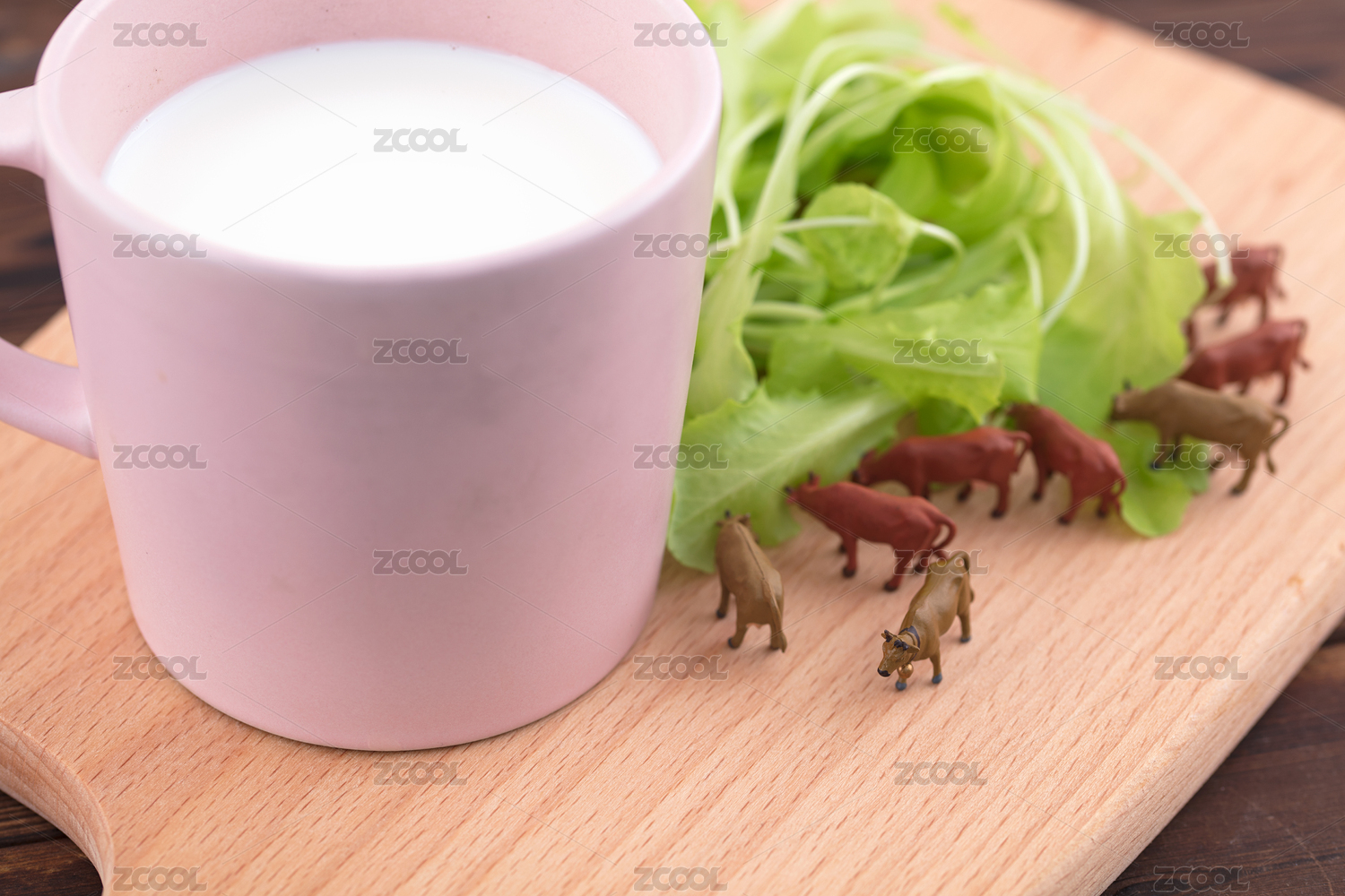 一杯牛奶和几只奶牛在砧板上