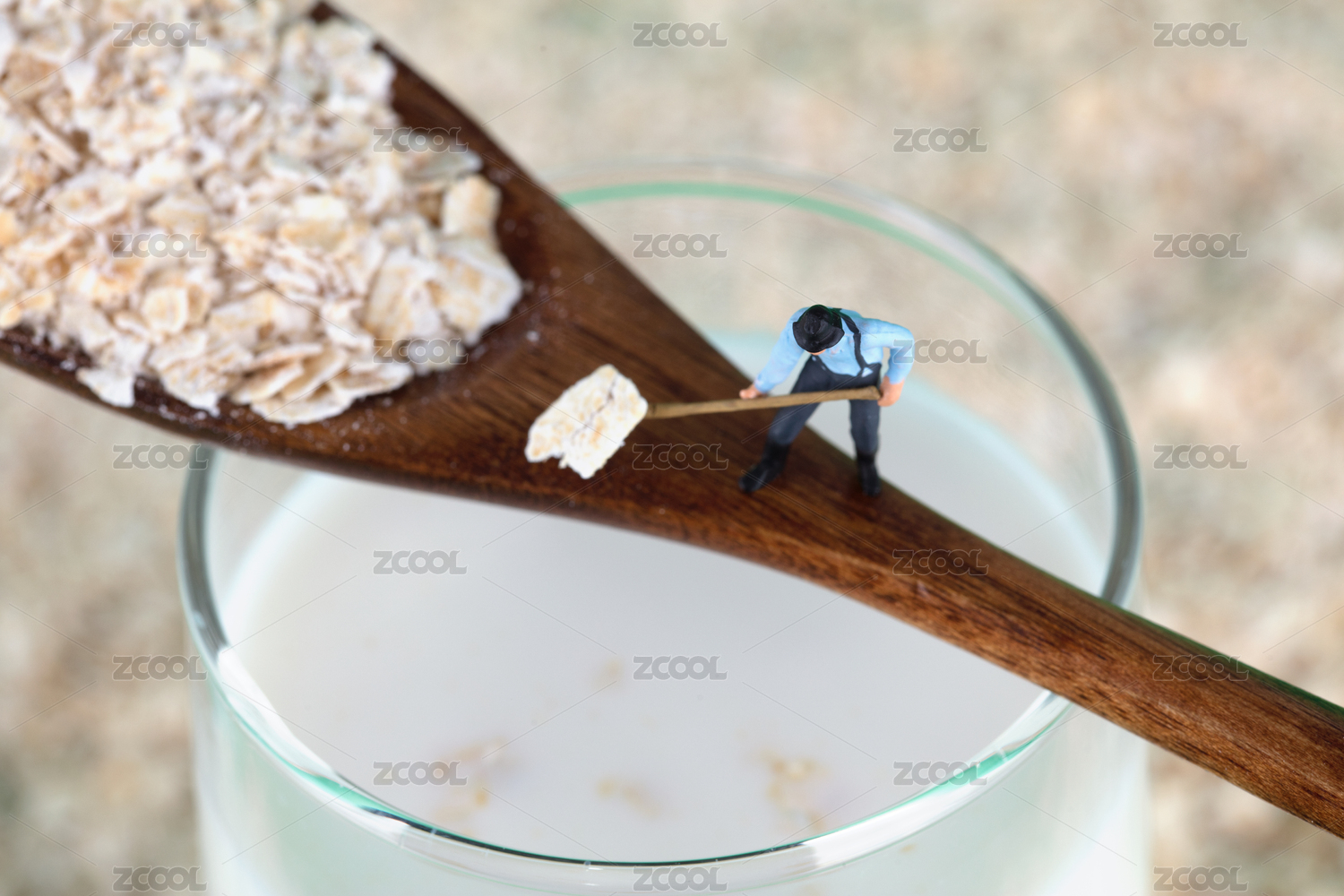 往牛奶里添加燕麦片的微缩人偶