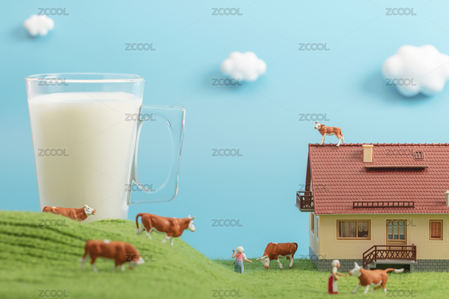微缩创意一杯牛奶与奶牛牧场