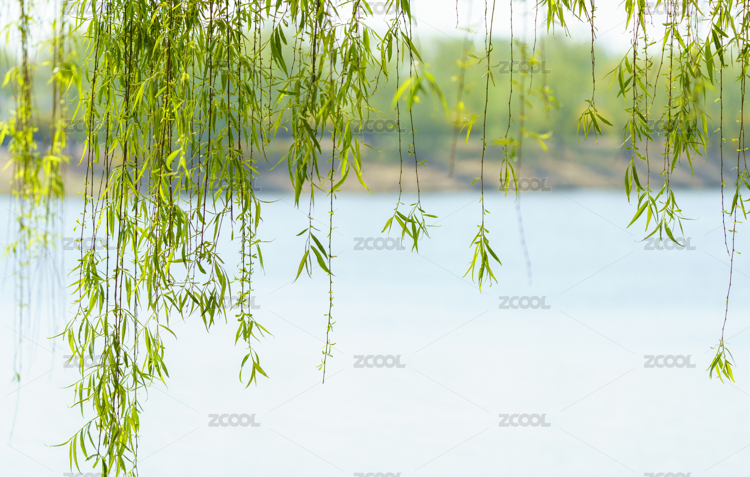 春天的玉渊潭公园内阳光下湖水与柳树枝桠