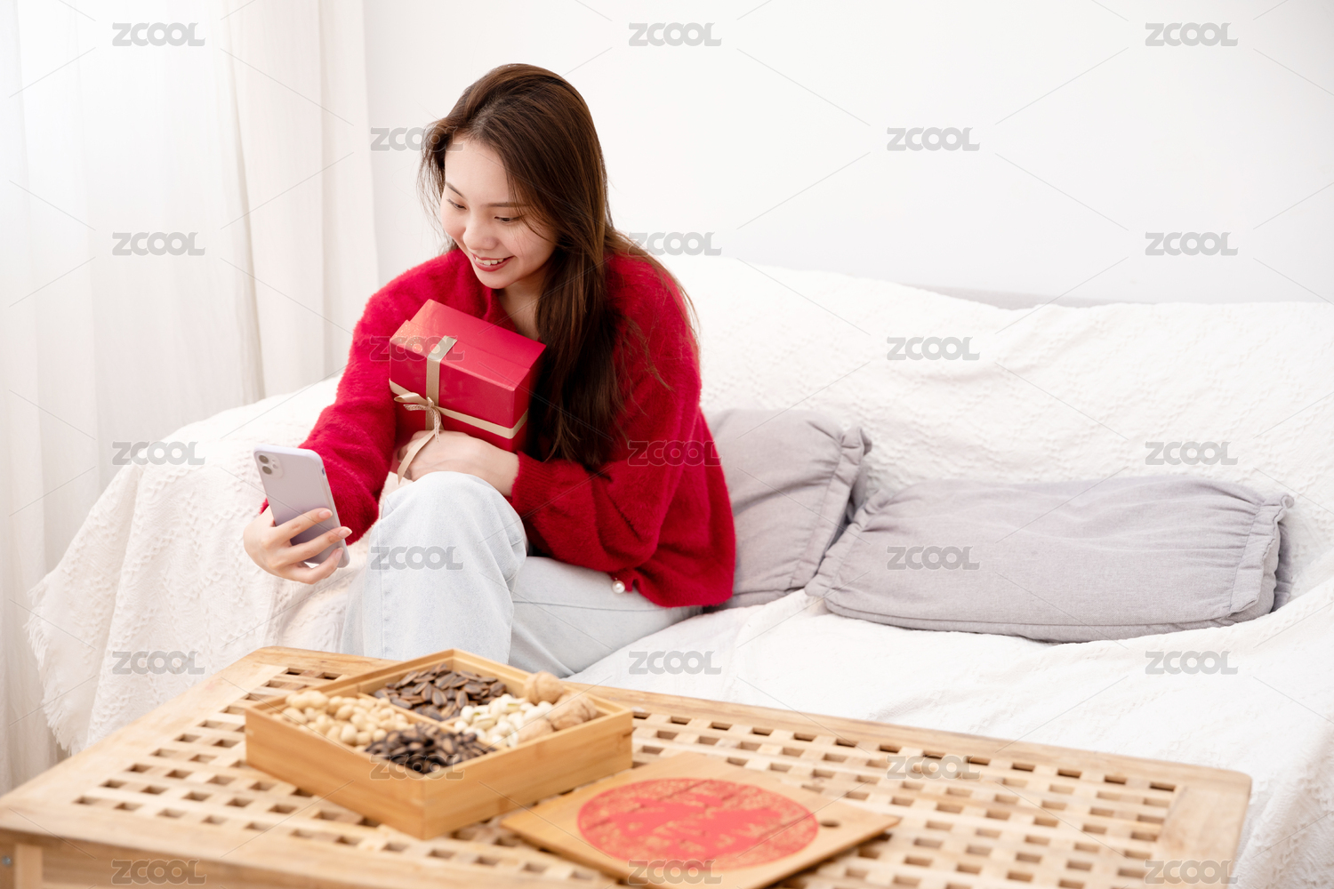 女性,一个人,坐着,沙发,冬天,温暖,美女,新年,过年,开心