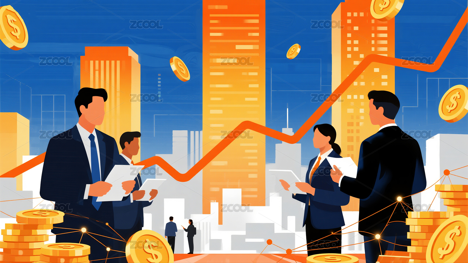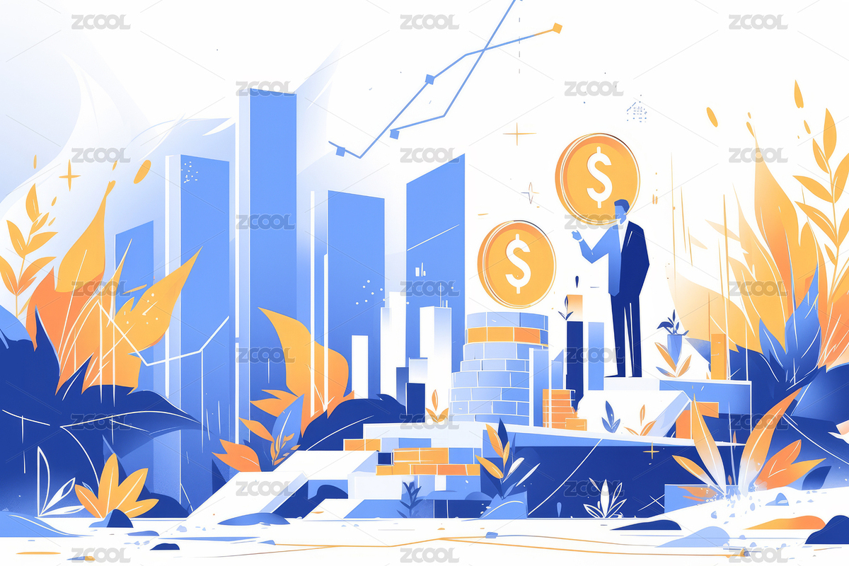 扁平插画,aigc,插画,条形图,人,金色,蓝色,黄色,背景,硬币