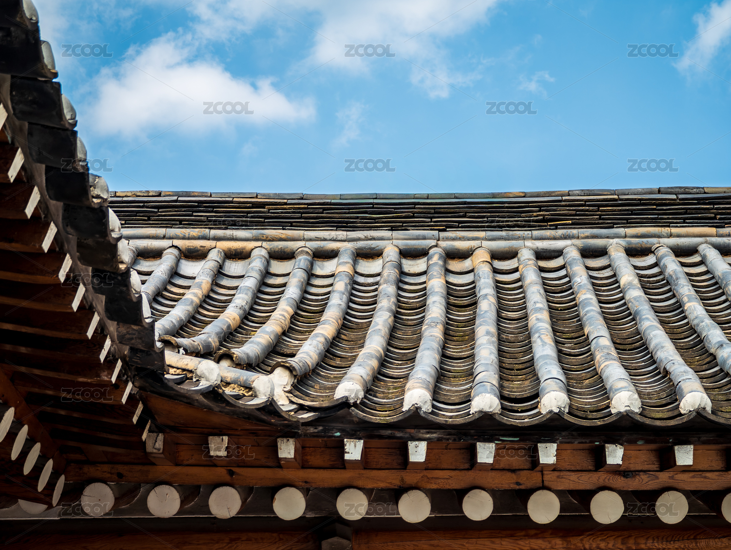 蔚蓝天空下的韩屋的黑色瓦片屋顶