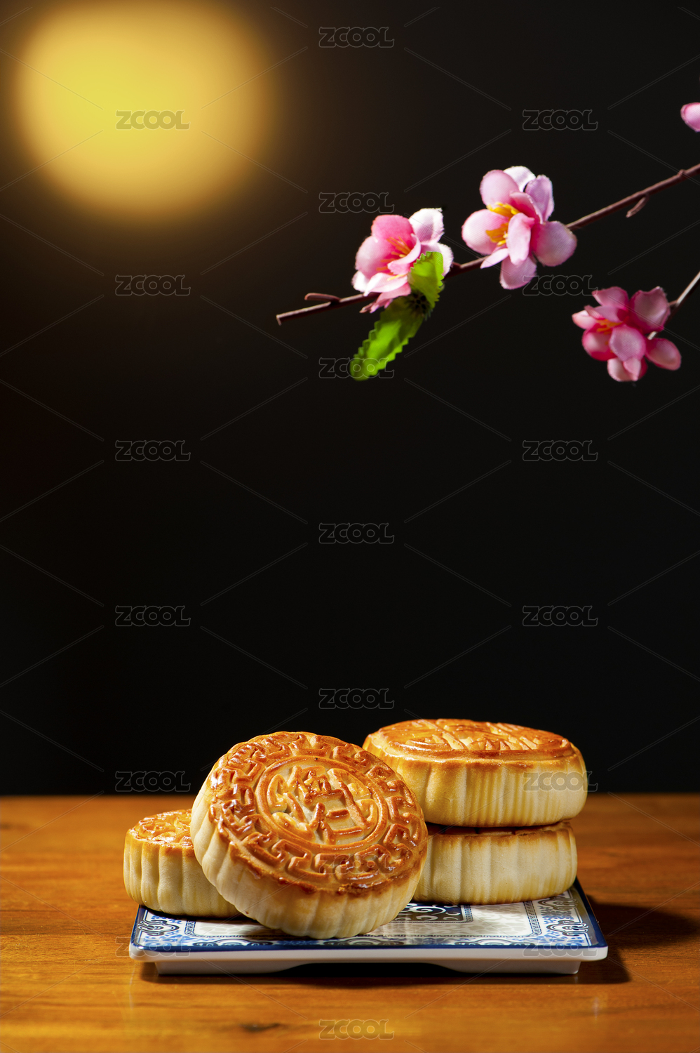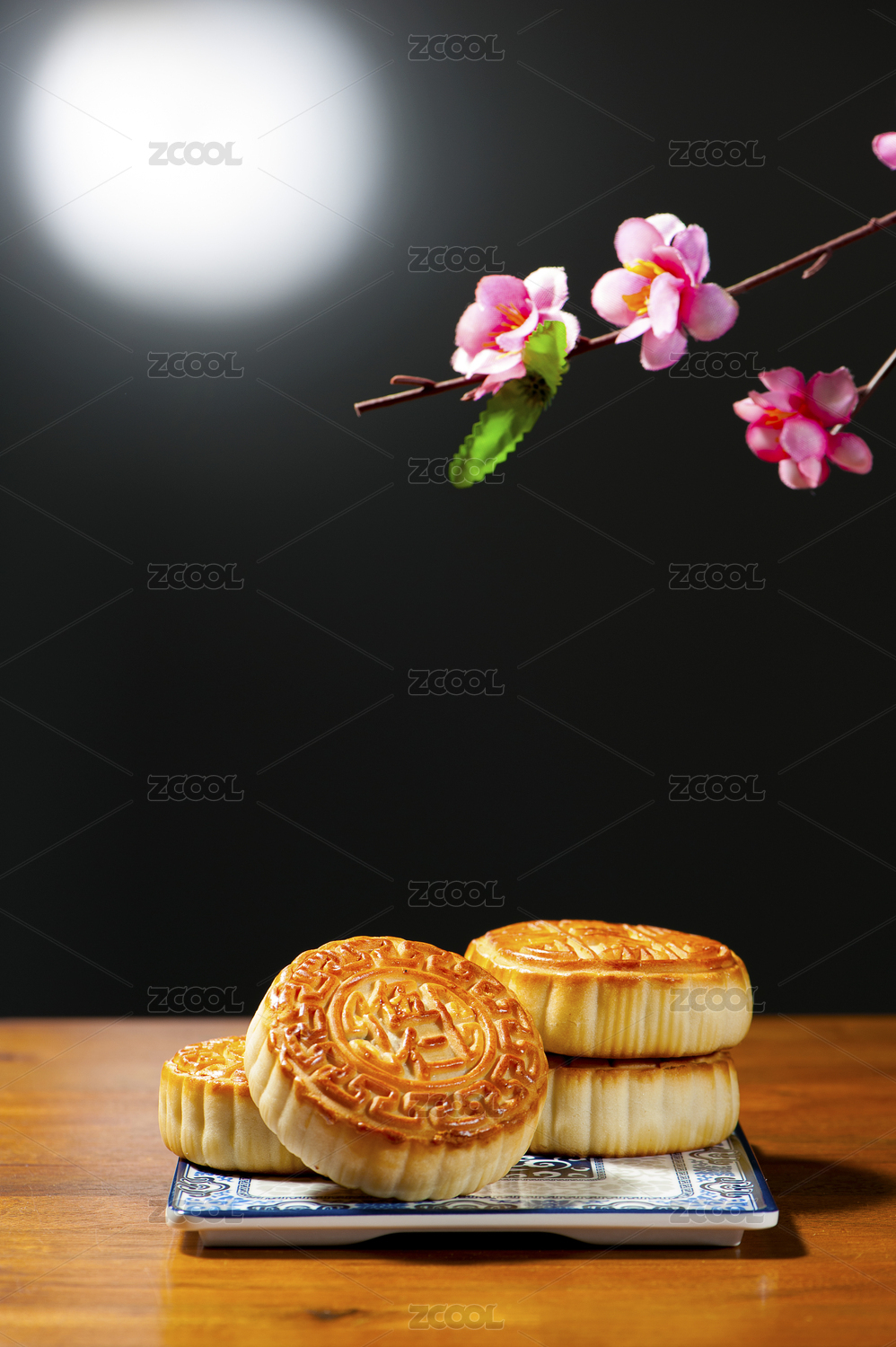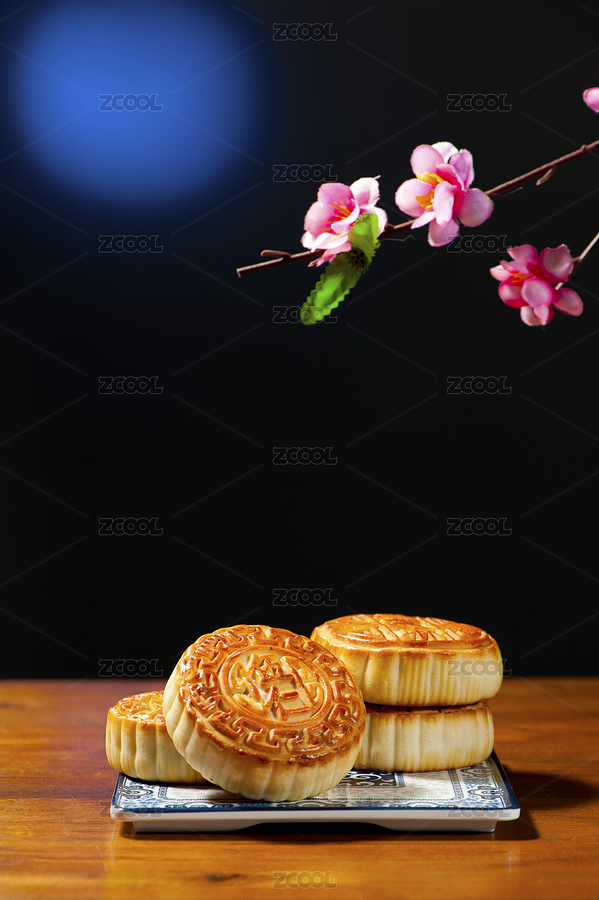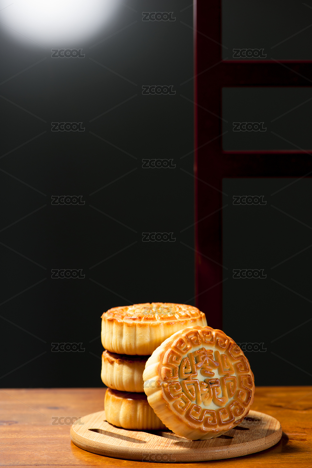 皎洁的月光背景下红木桌面摆放着月饼