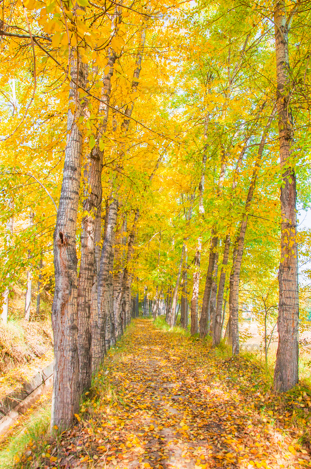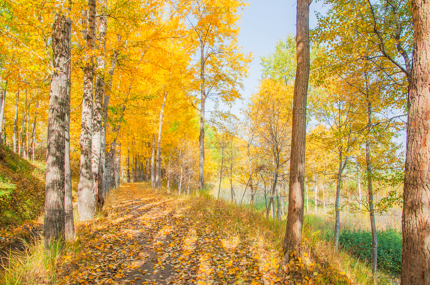 秋天黄绿交替的山间小路白桦林美景