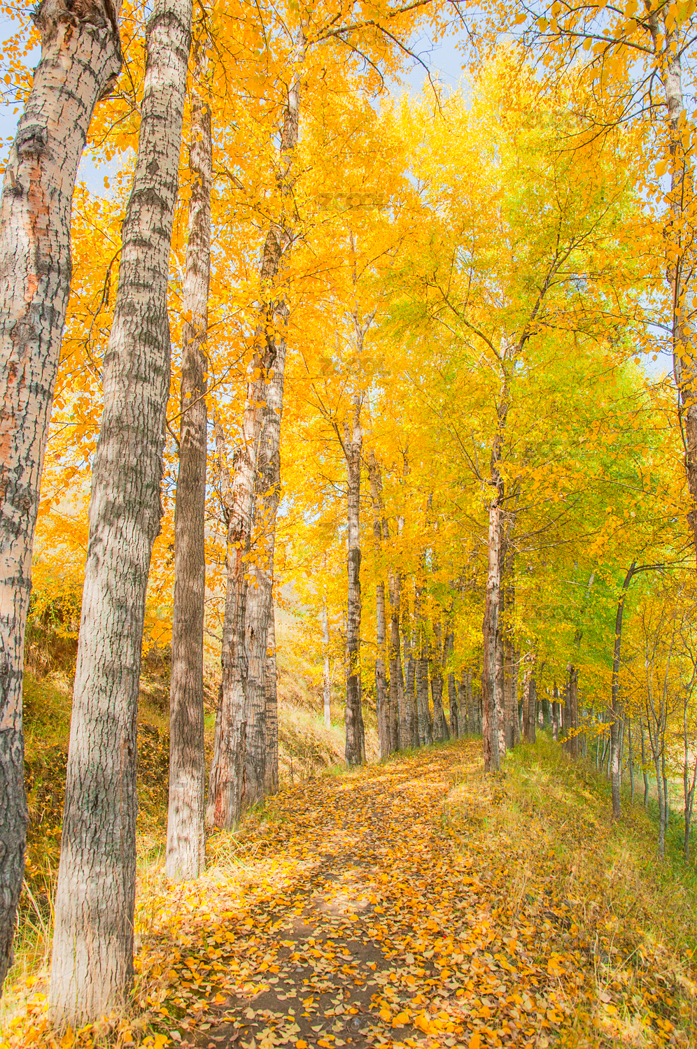 中国青海湟源县秋天早晨的金色白桦林