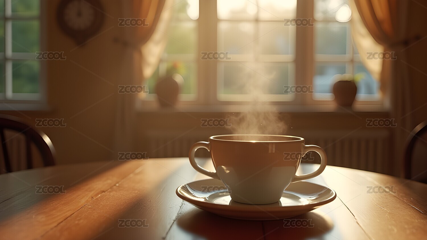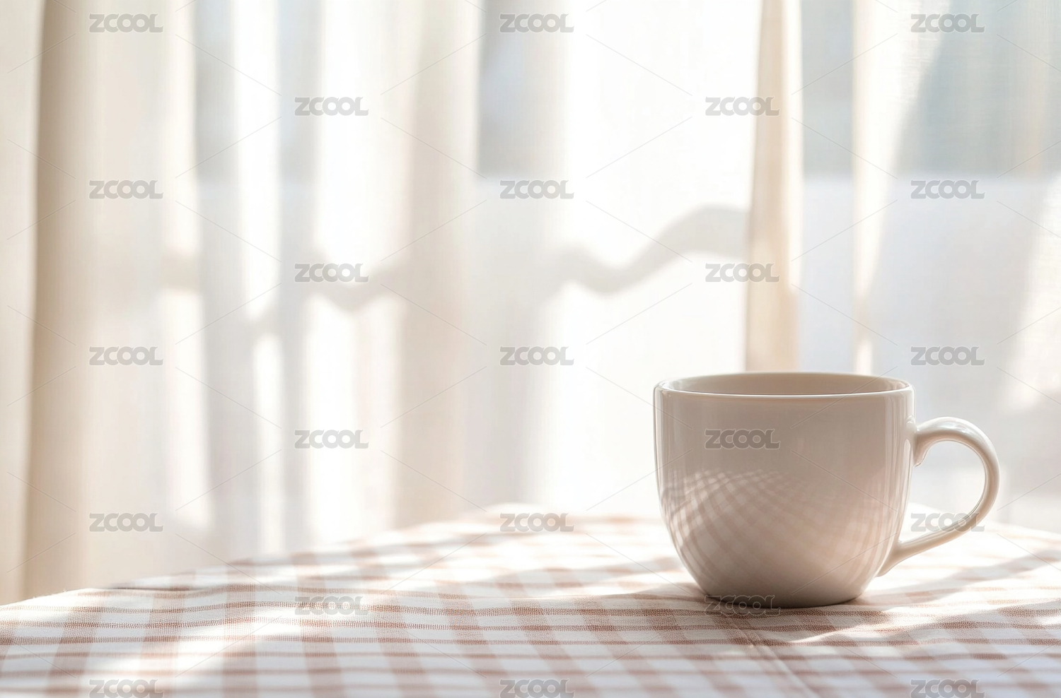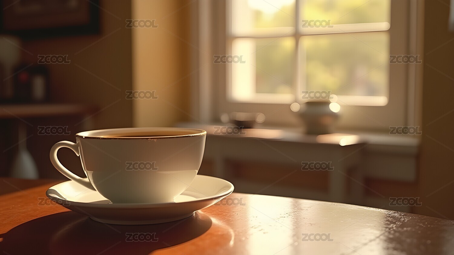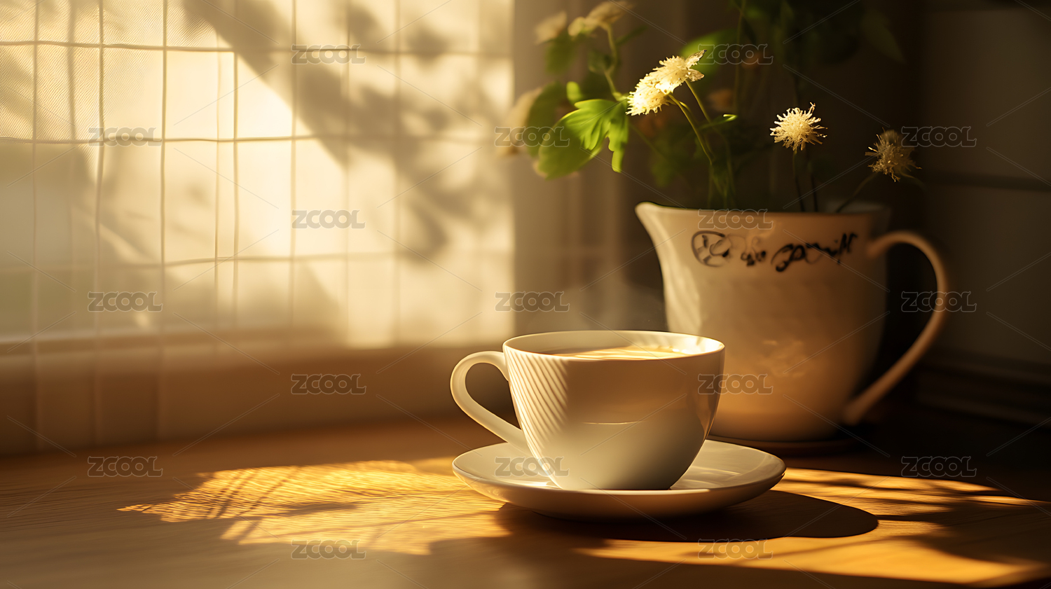 窗边桌上咖啡杯与柠檬的温馨光影场景