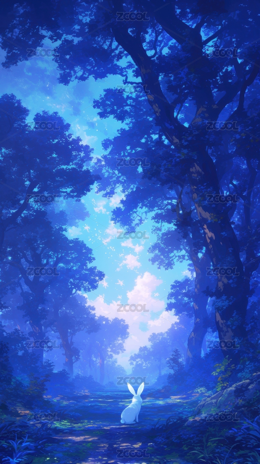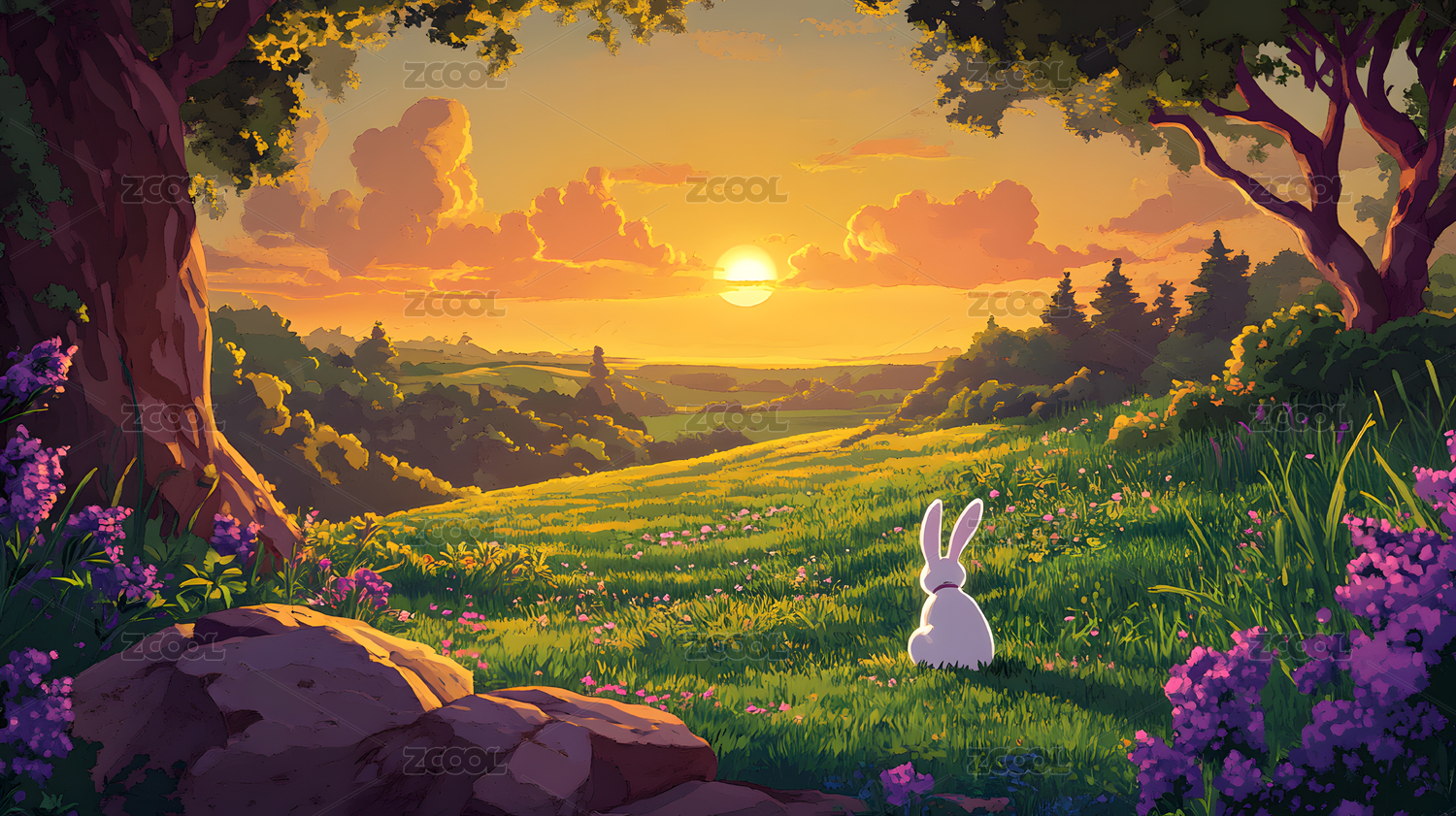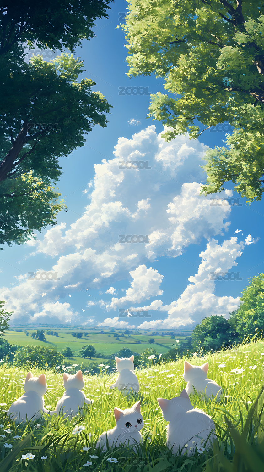 晴朗的天空,草地上一群小动物在愉快的玩耍