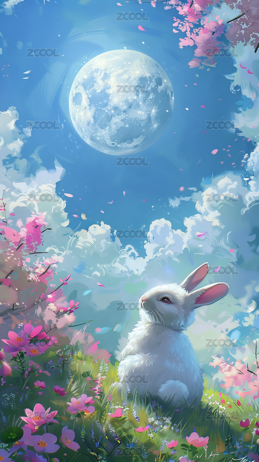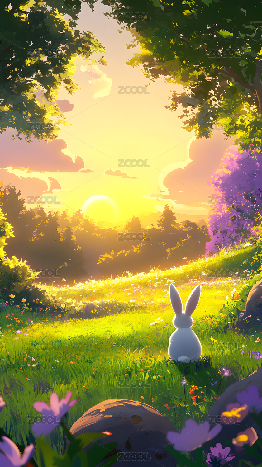 晴朗野外一只长耳朵红眼睛白兔3D卡通插画