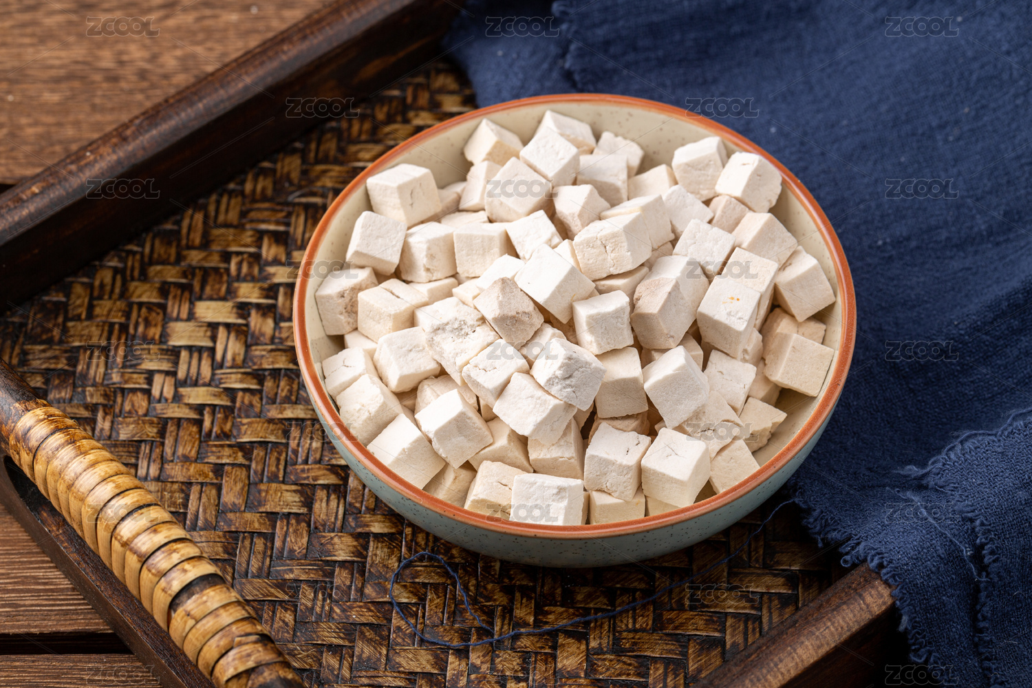 中式复古场景中装在木盘中的茯苓块