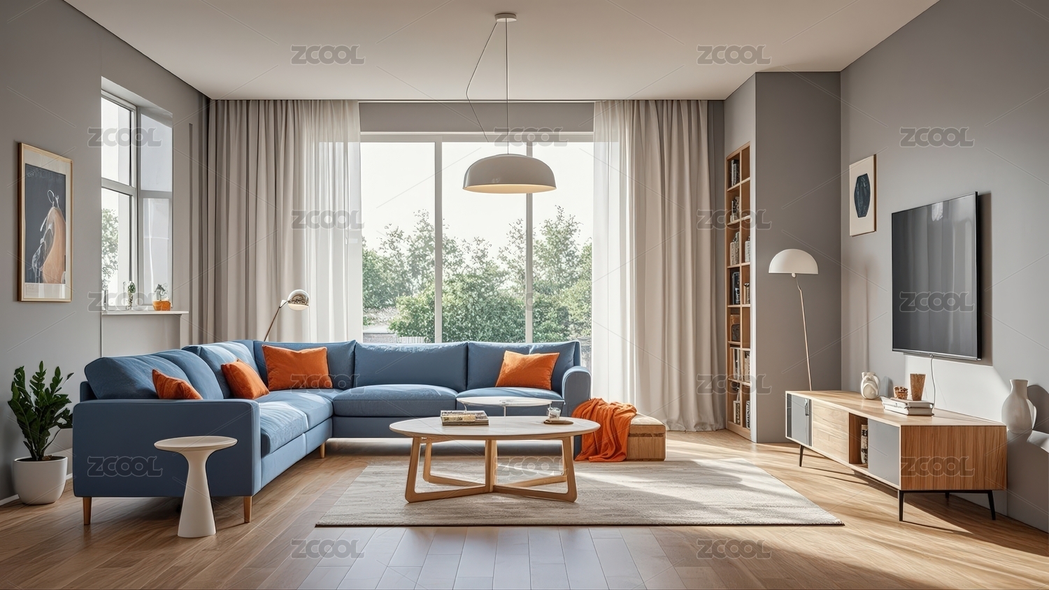 客厅, 布艺沙发, 窗帘, 茶几, 植物, 家具, 沙发, 室内设计, 地毯, 灯具