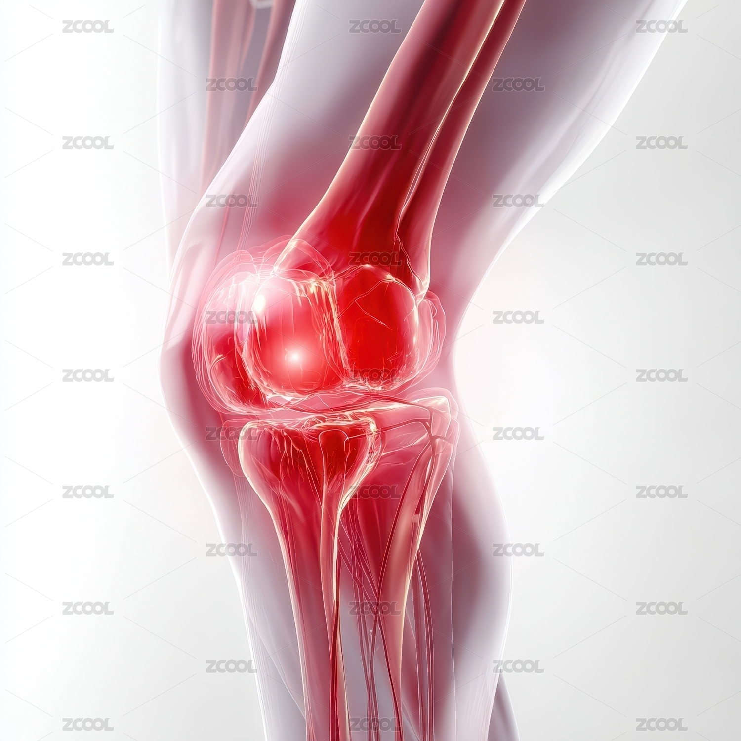 膝盖疼痛,红色区域显示炎症,