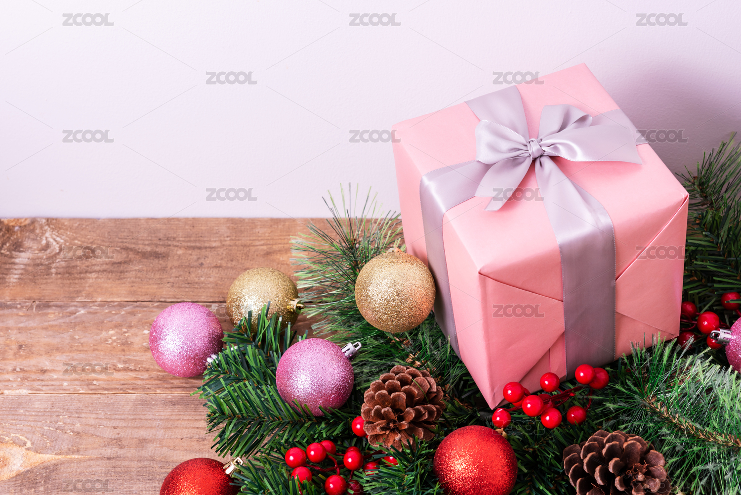 圣诞礼盒和圣诞节装饰品在桌子上,圣诞节节日礼物背景,粉色的礼盒和圣诞树,圣诞球,松果在桌子上