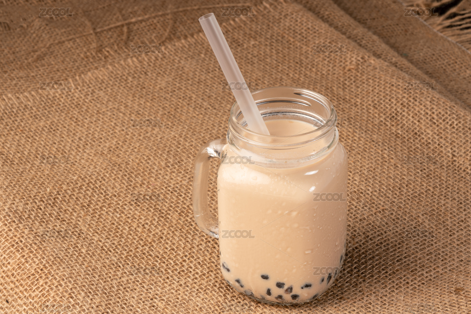 粗麻布上的玻璃杯,玻璃杯里的珍珠奶茶