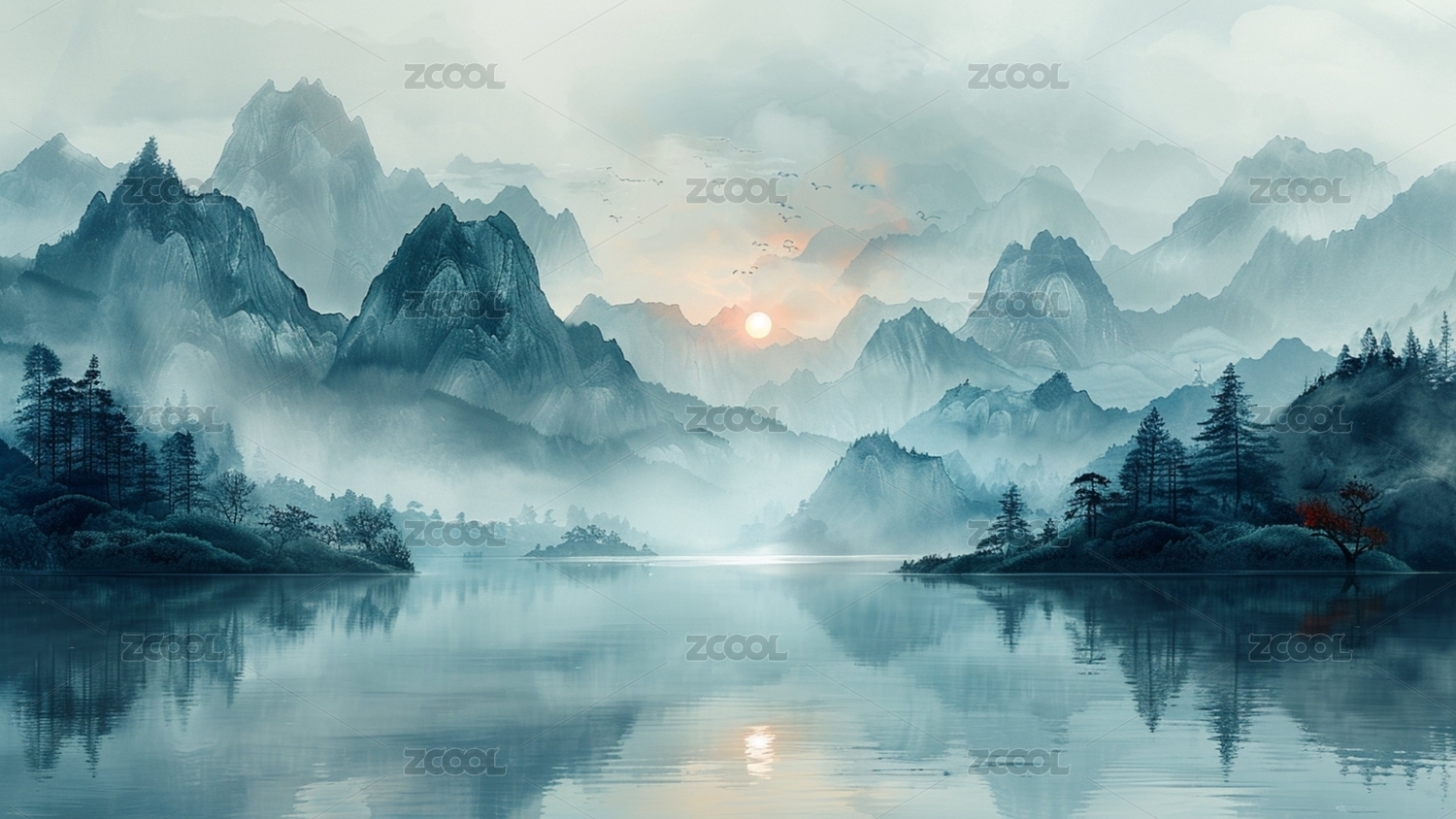 蓝色调的水墨风山水画,水墨风意境山水画概