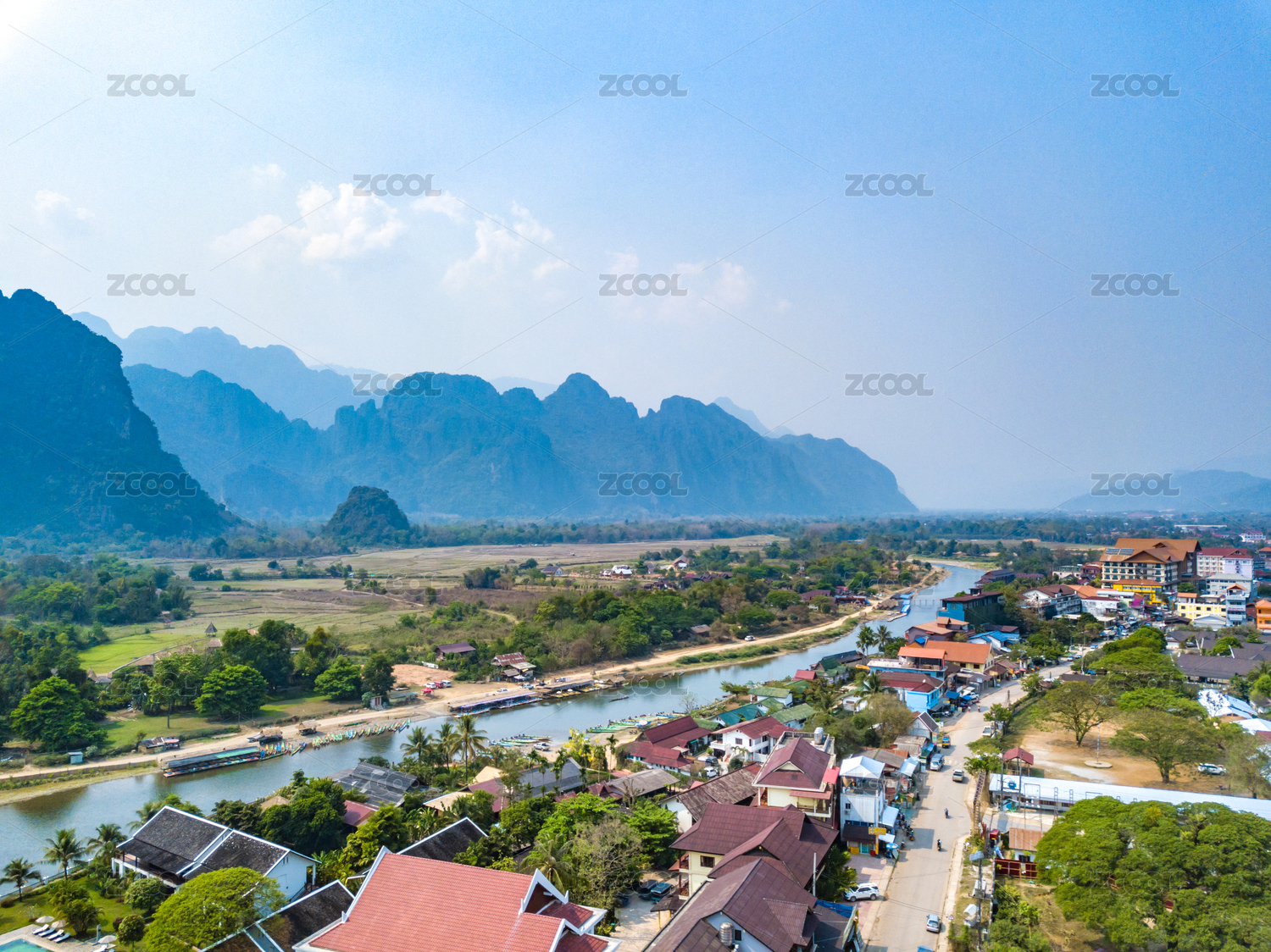 Panoramic Landscape and Townscape of Vang Vieng, Laos, Southeast Asia