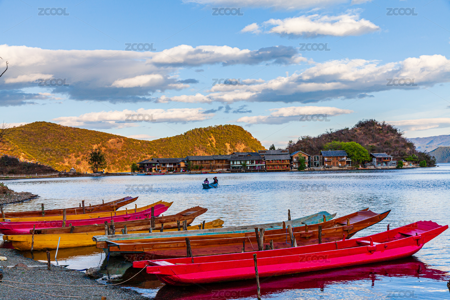 中国泸沽湖上彩色的猪槽船