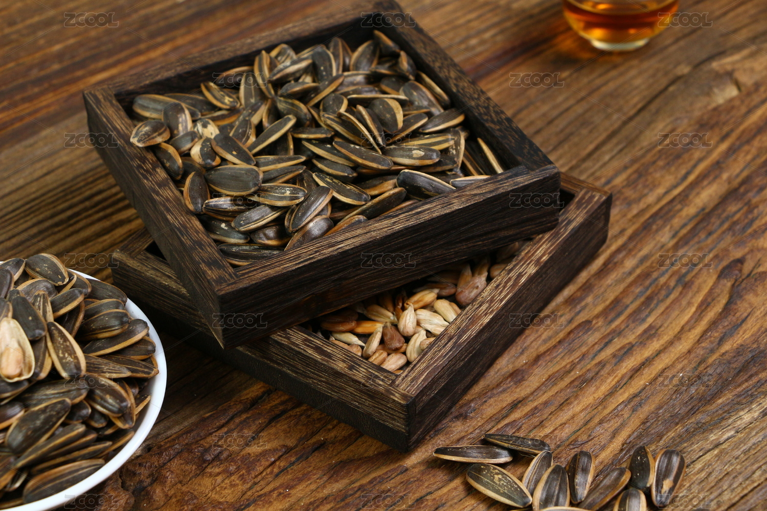 一盘葵瓜子摆放在古窗棂木桌面上特写