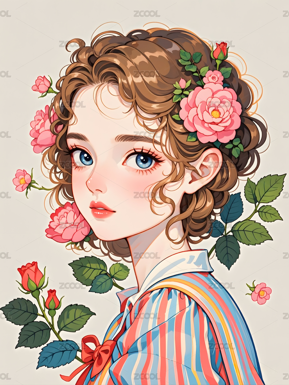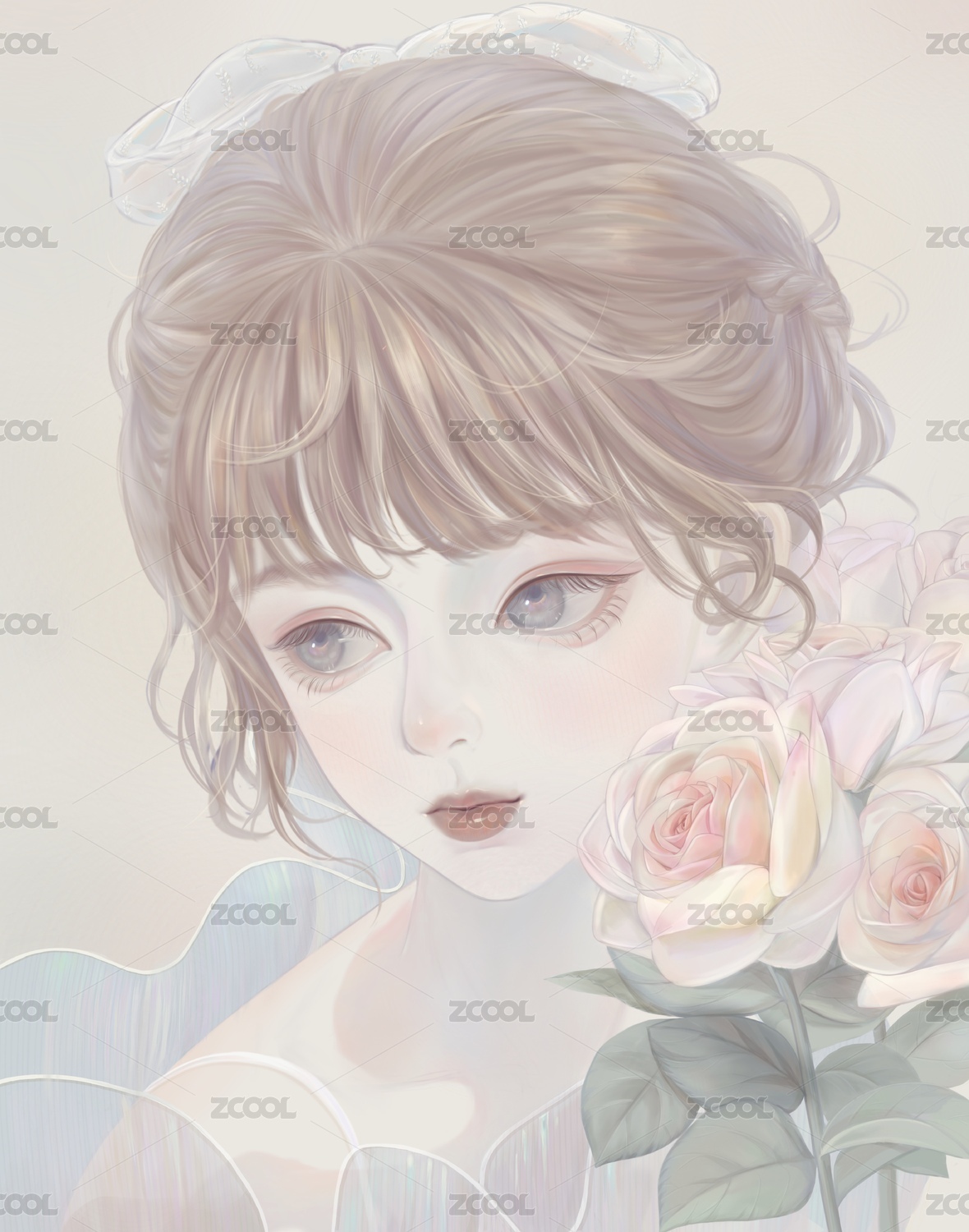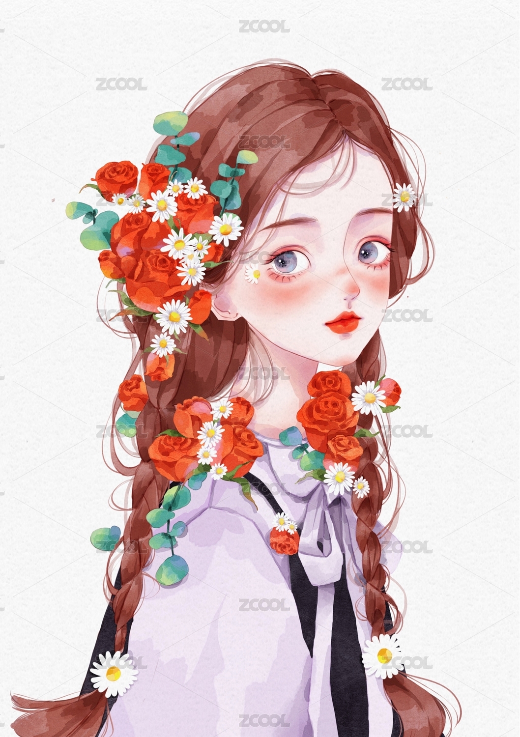 清新治愈系玫瑰花可爱少女人物 板绘仿水彩