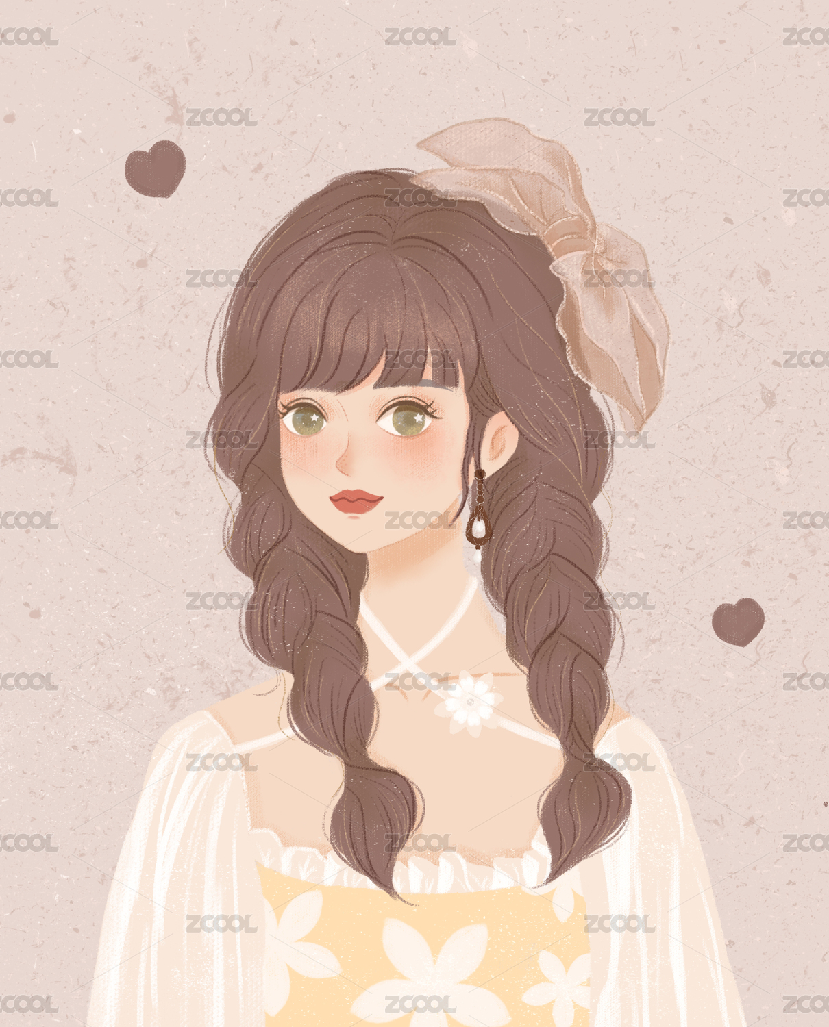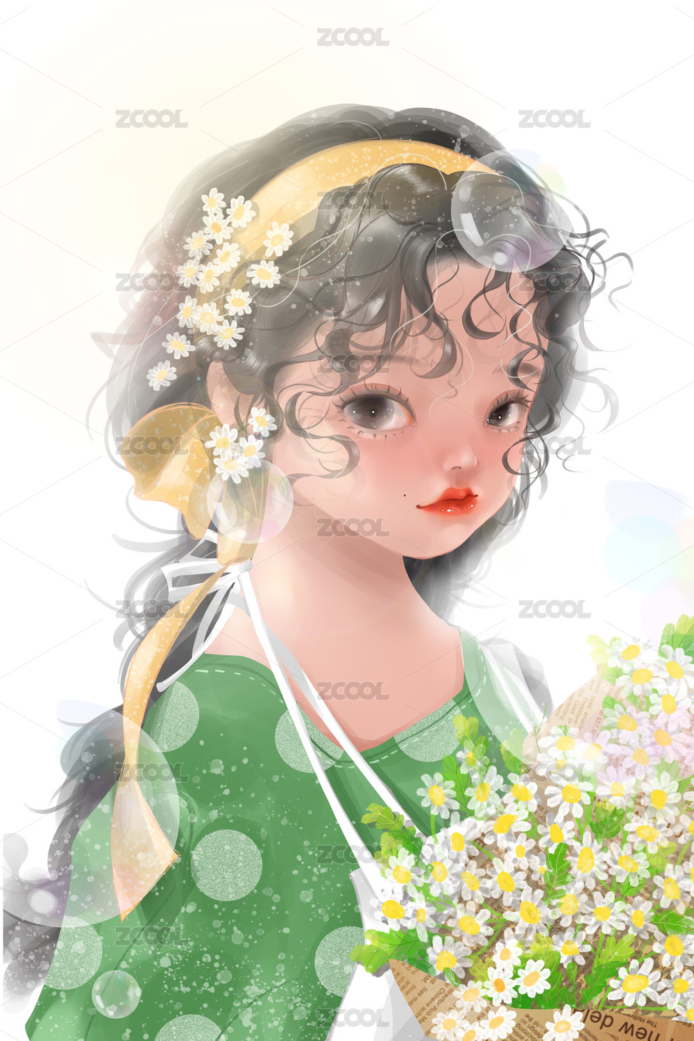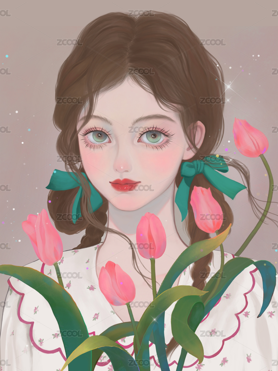 郁金香花朵蝴蝶结麻花辫温柔少女插画