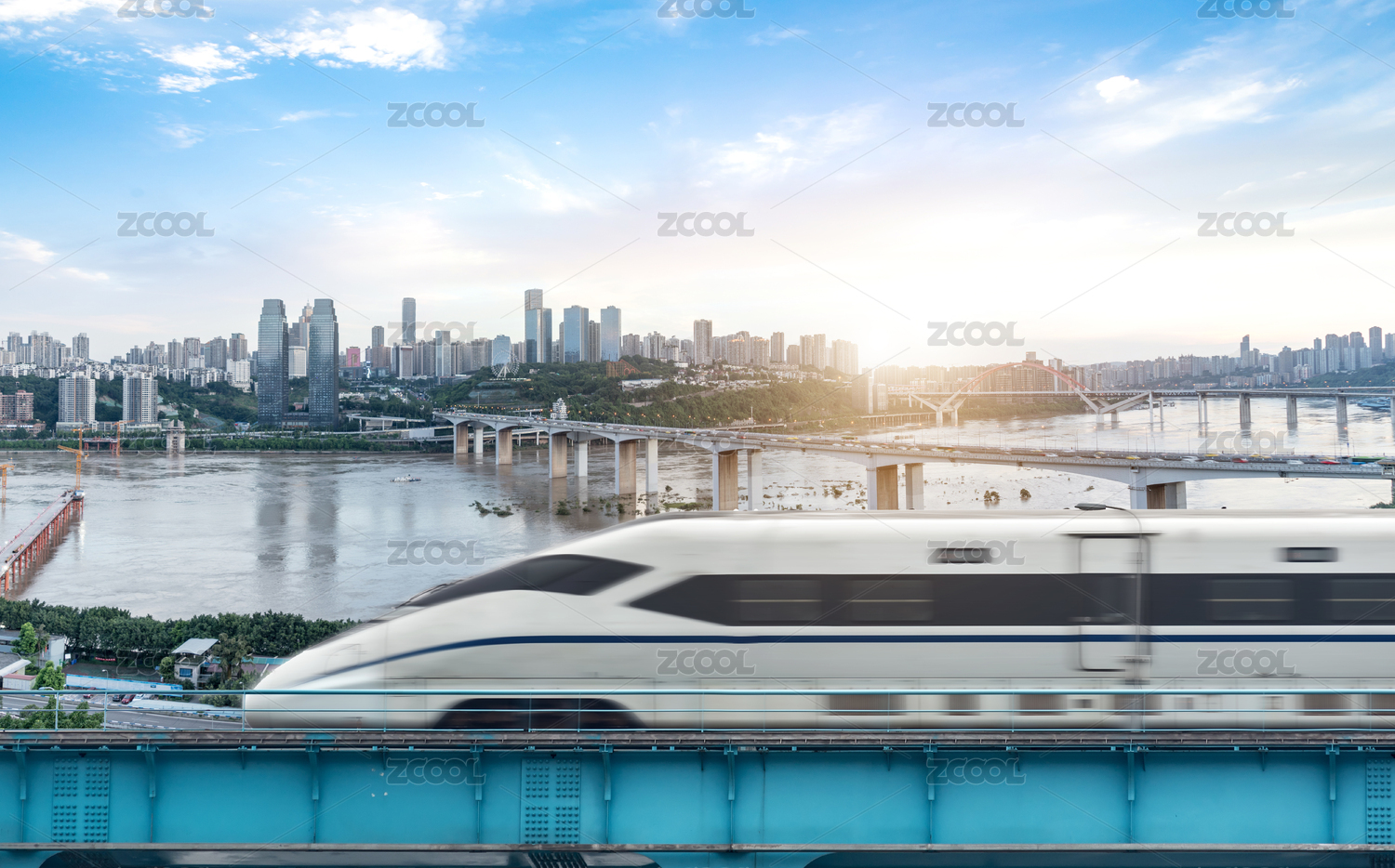 高速列车行驶在现代城市,背景是现代城市建
