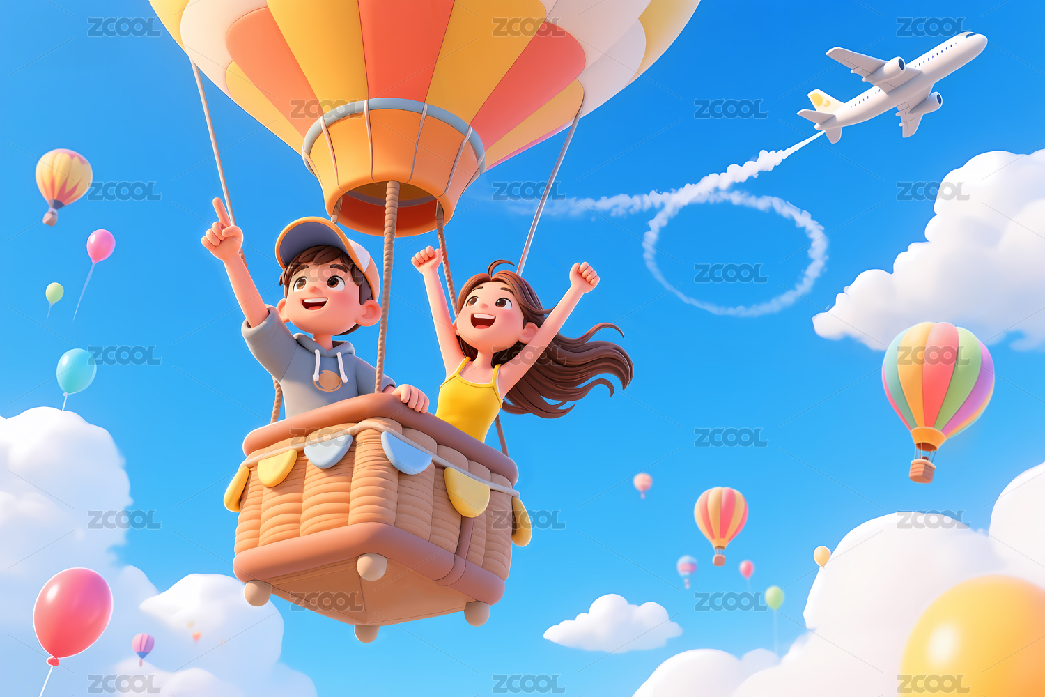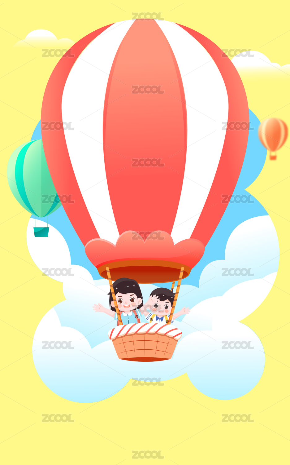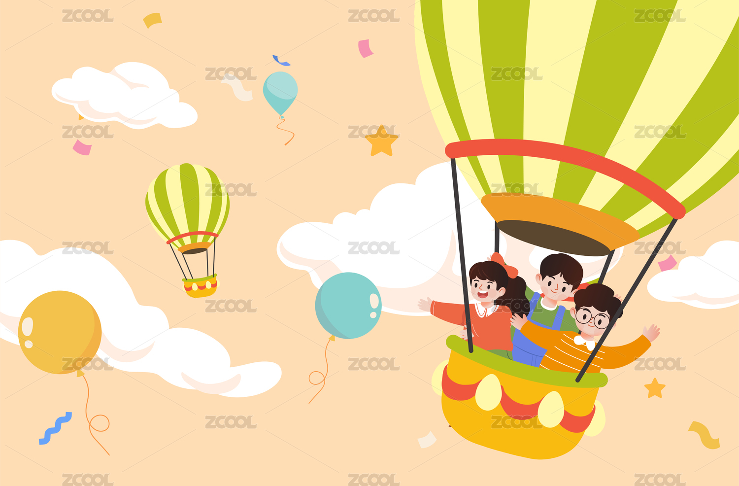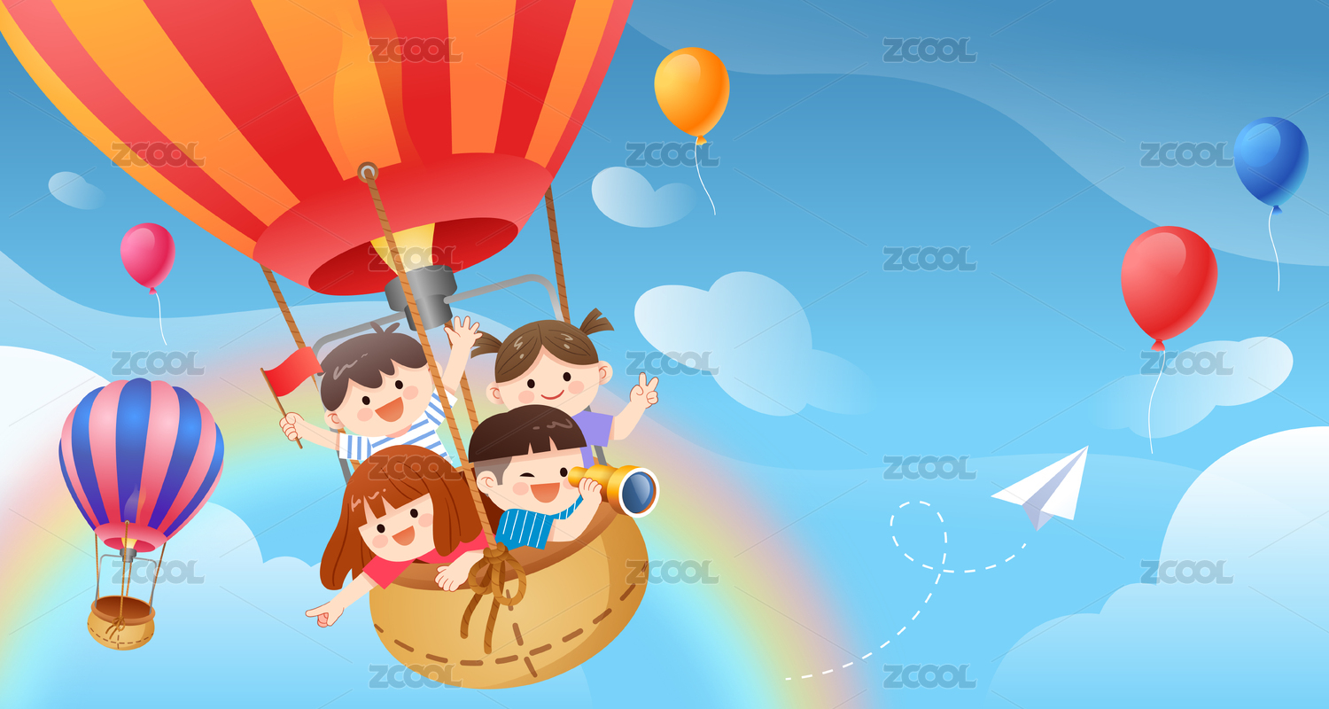 天空中一群儿童乘坐热气球