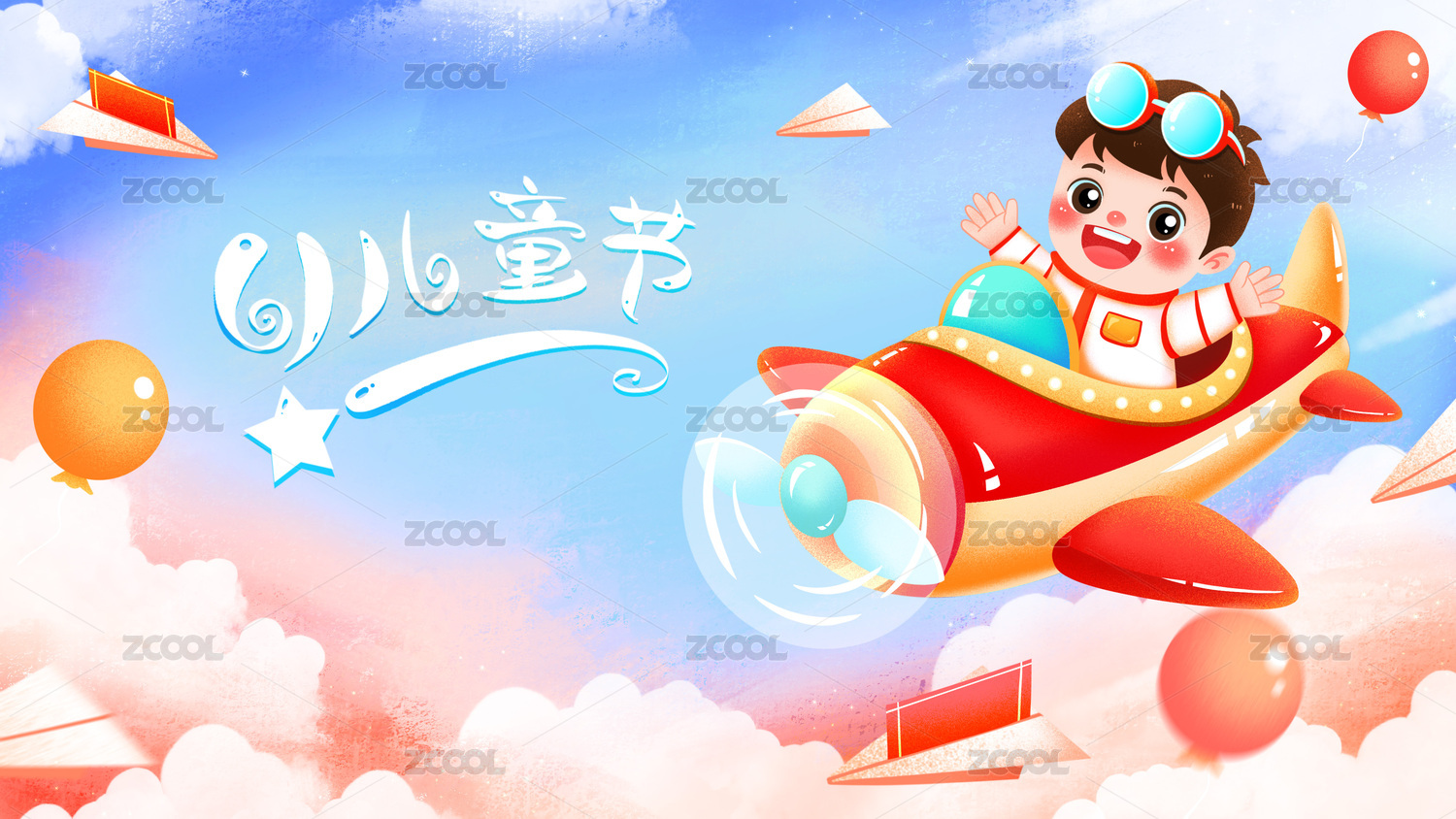 六一节儿童驾驶飞机等插画