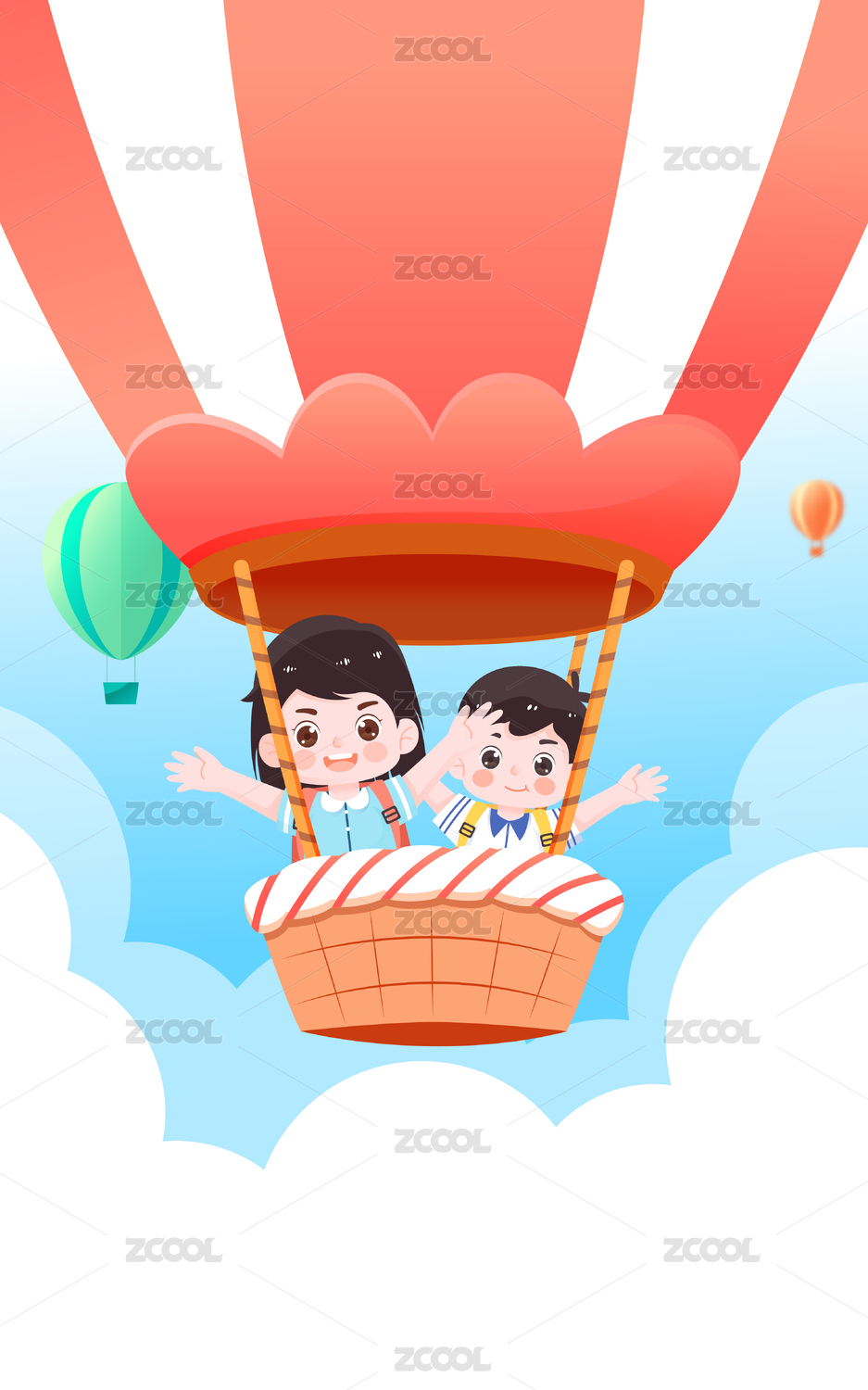 儿童乘坐热气球插画