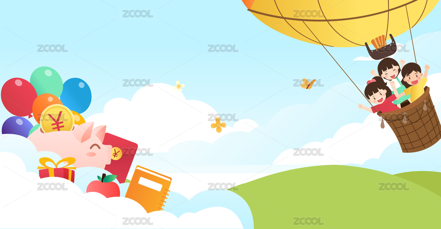 一群儿童乘坐热气球飞行在蓝天上
