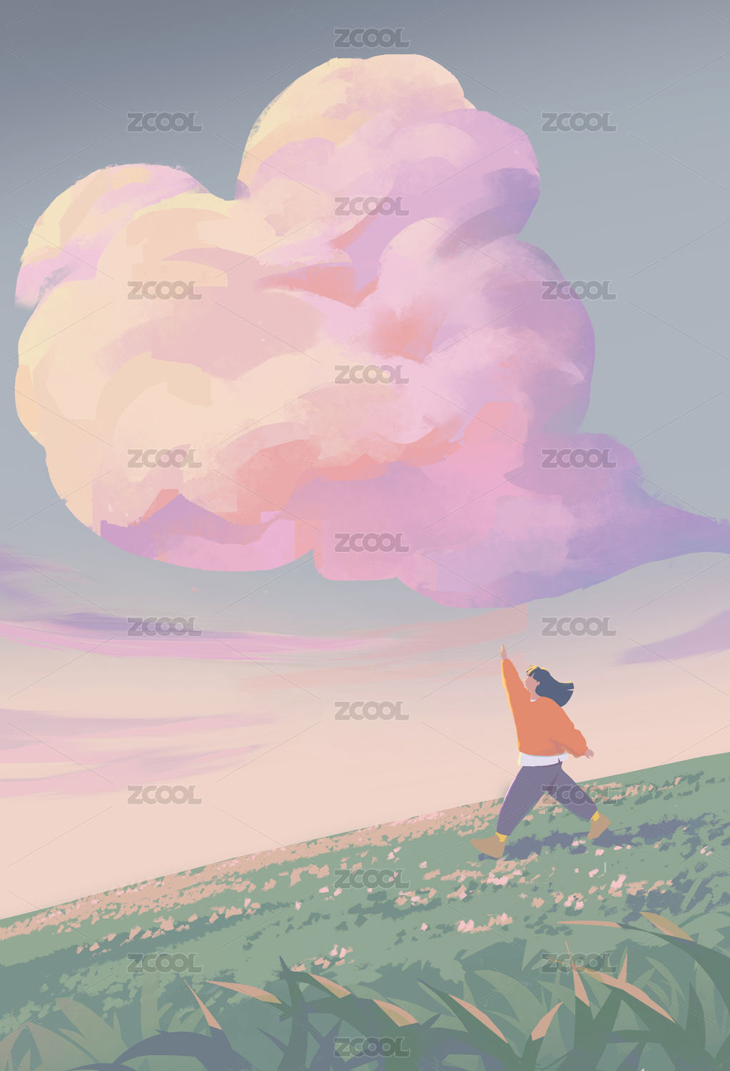 树草地景观和人物插画横版粉色天