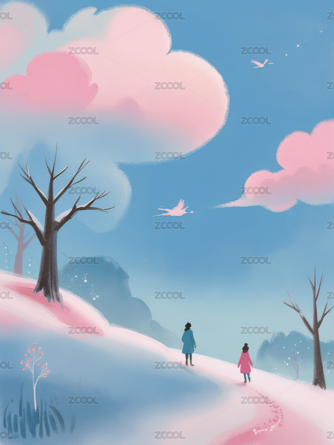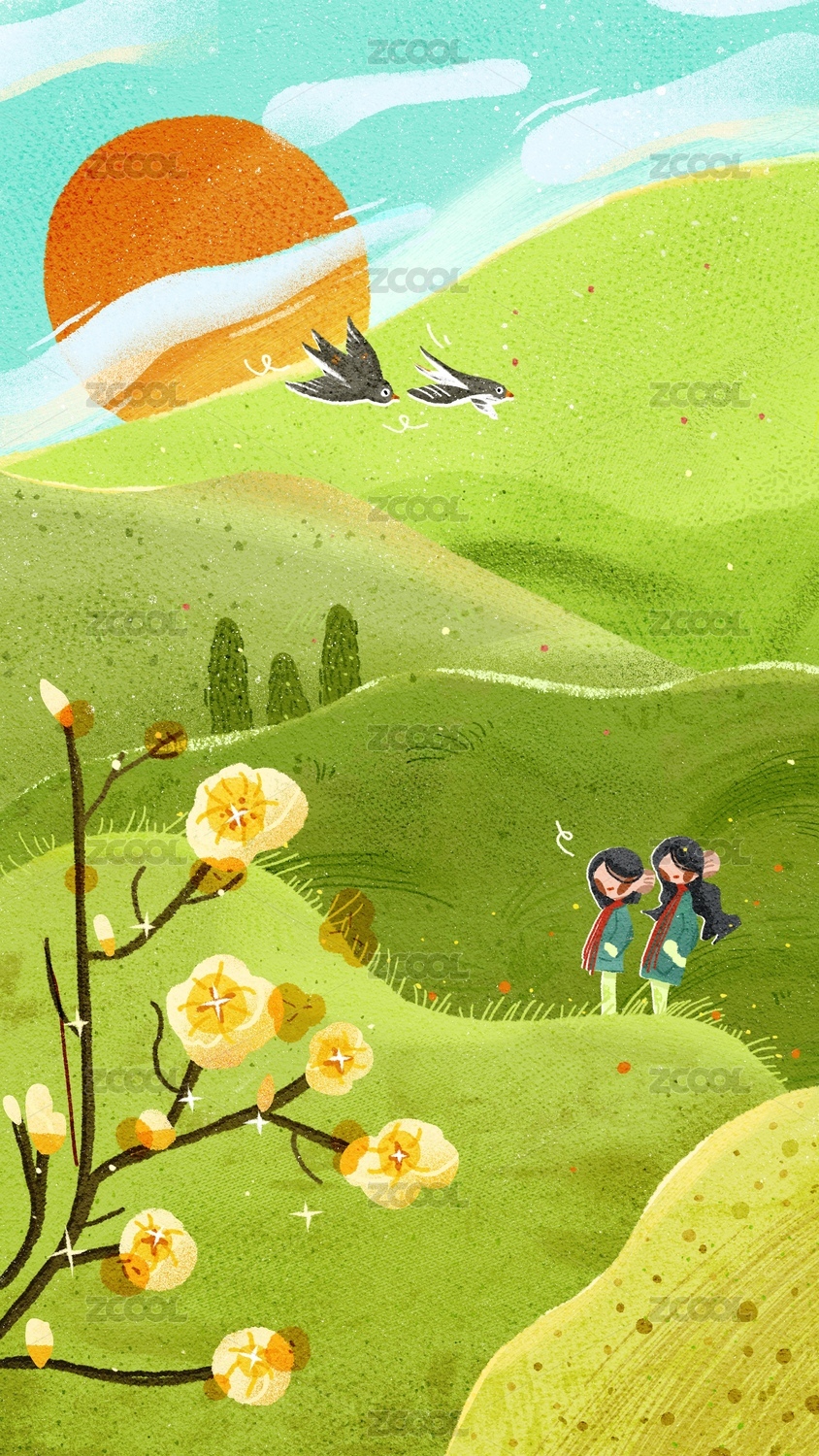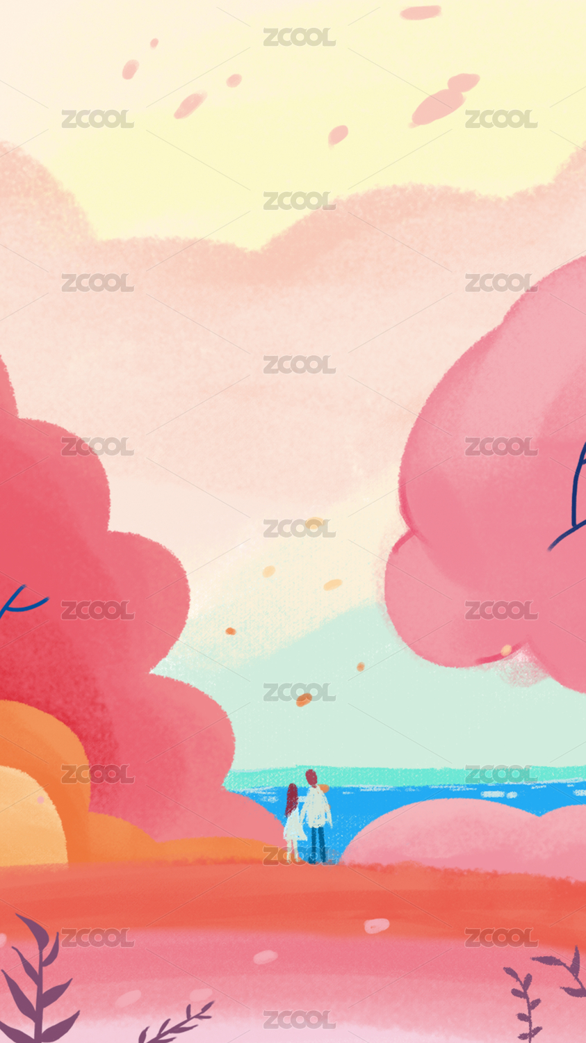 树草地和人物竖版黄色树粉色天插画