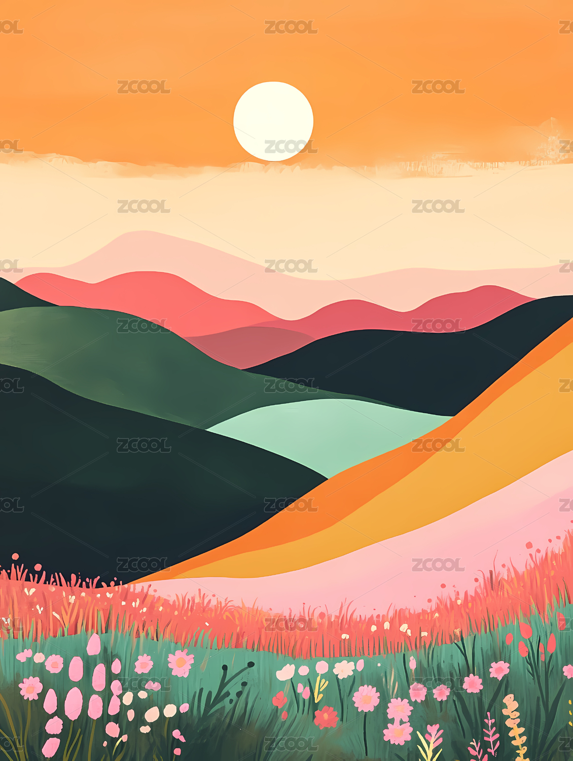 太阳照耀下的红色山坡景观插画
