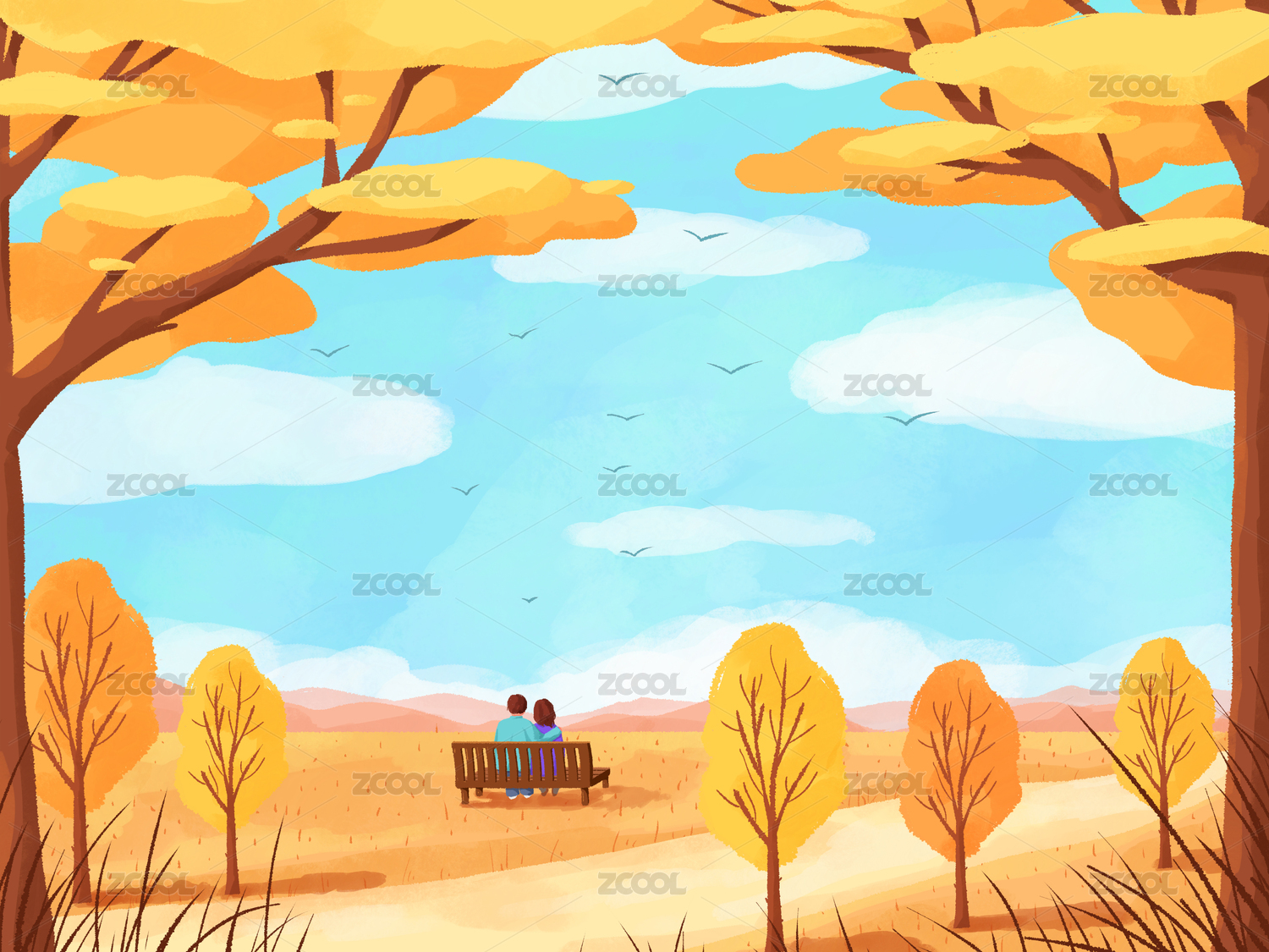 树草地和人物竖版黄色树蓝天插画
