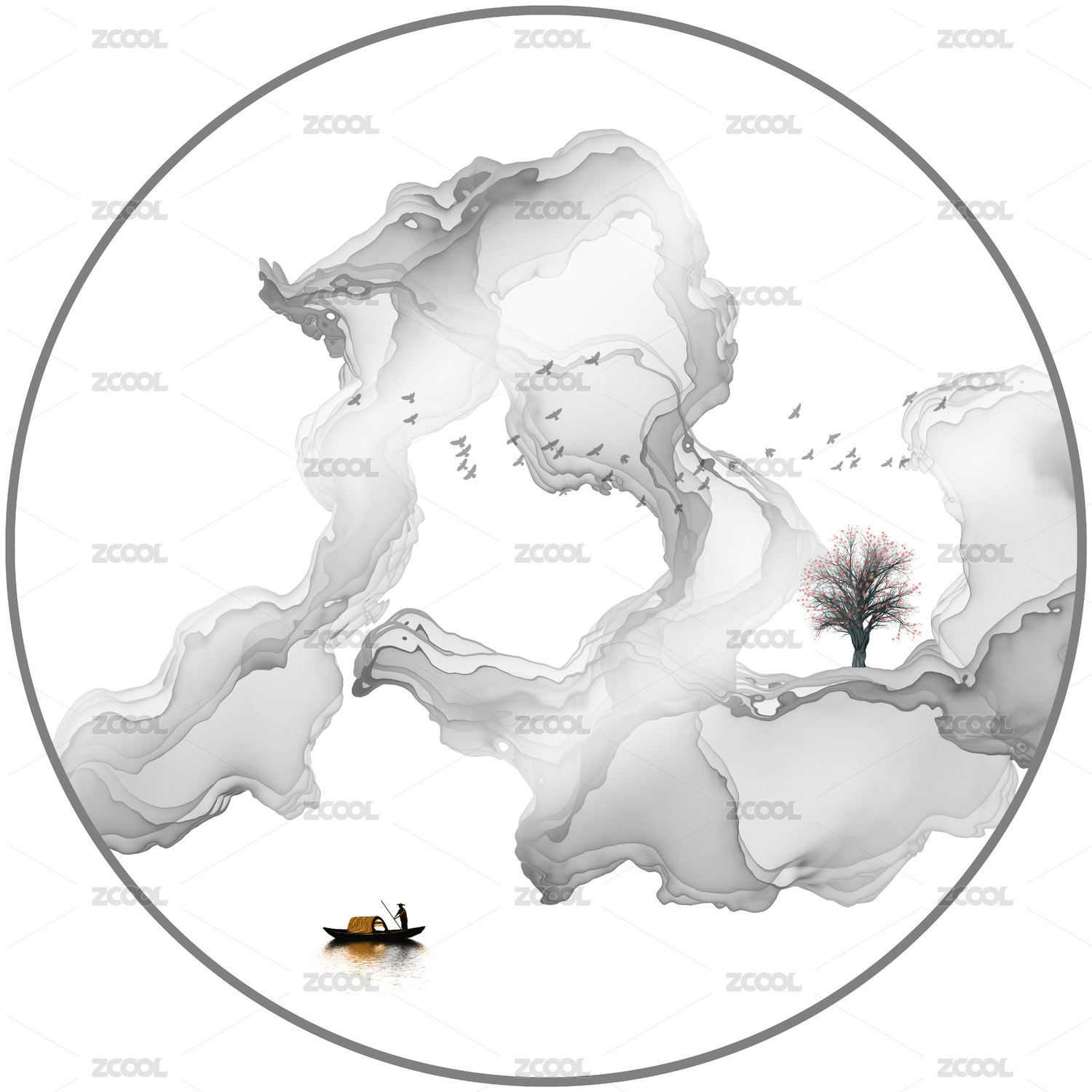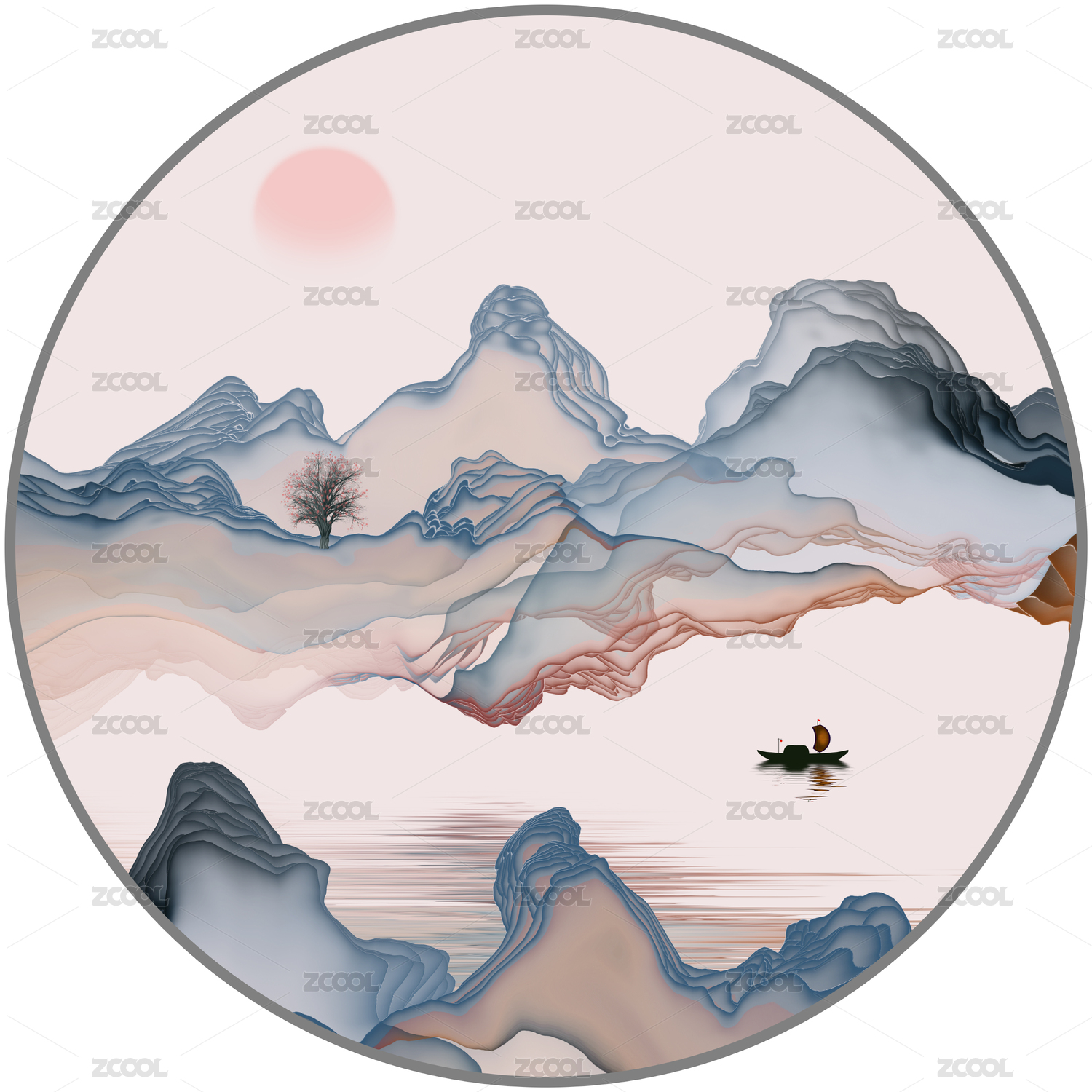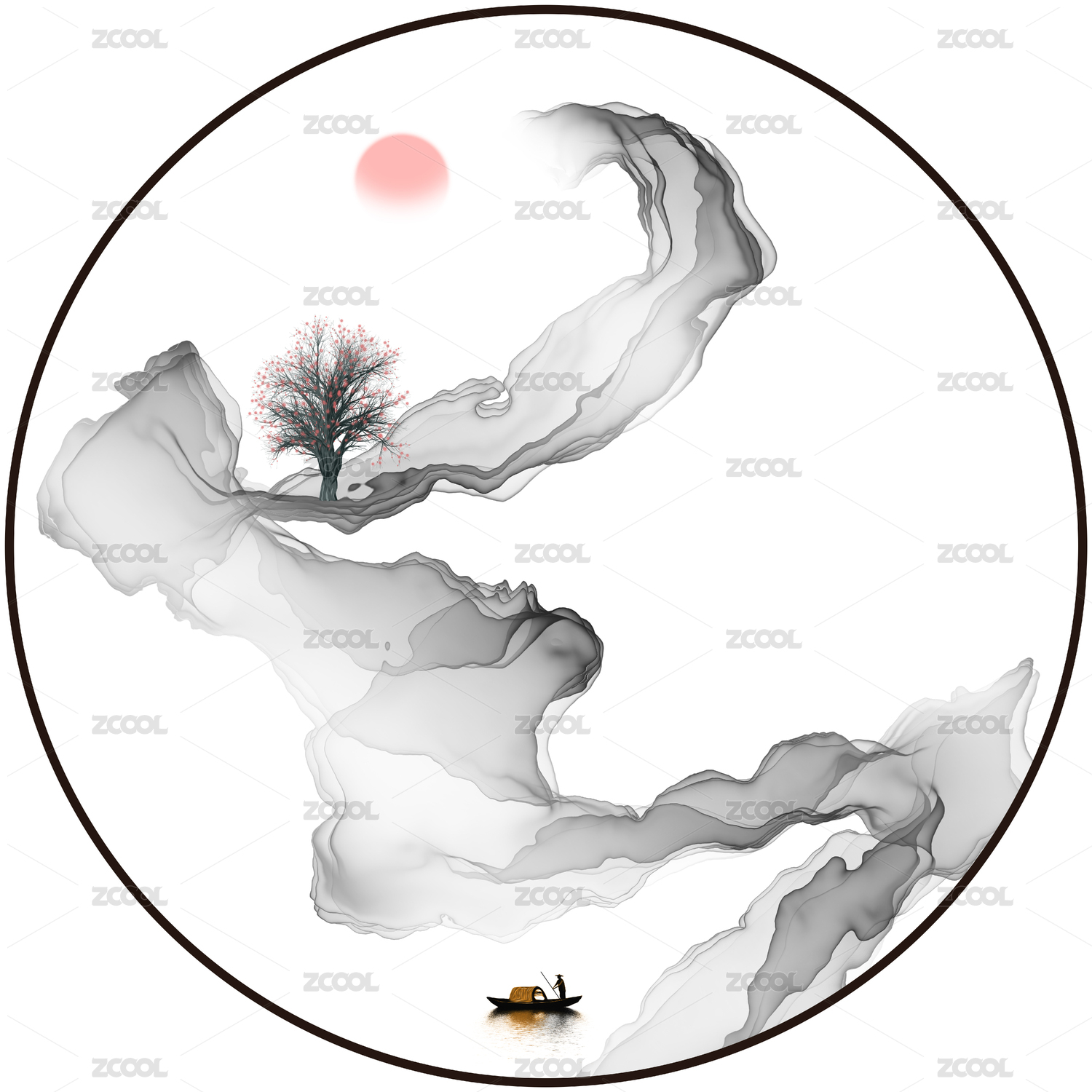 圆形水墨山水装饰画