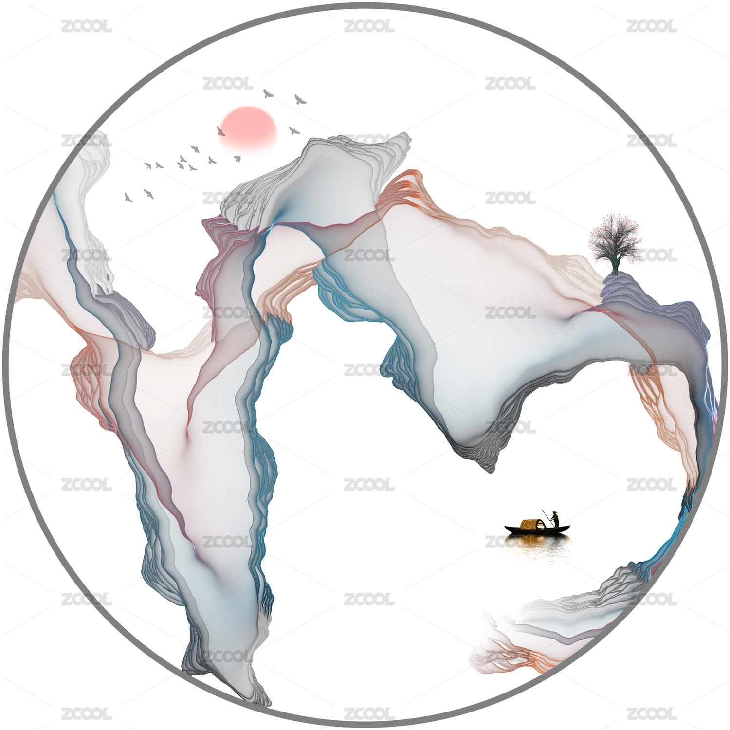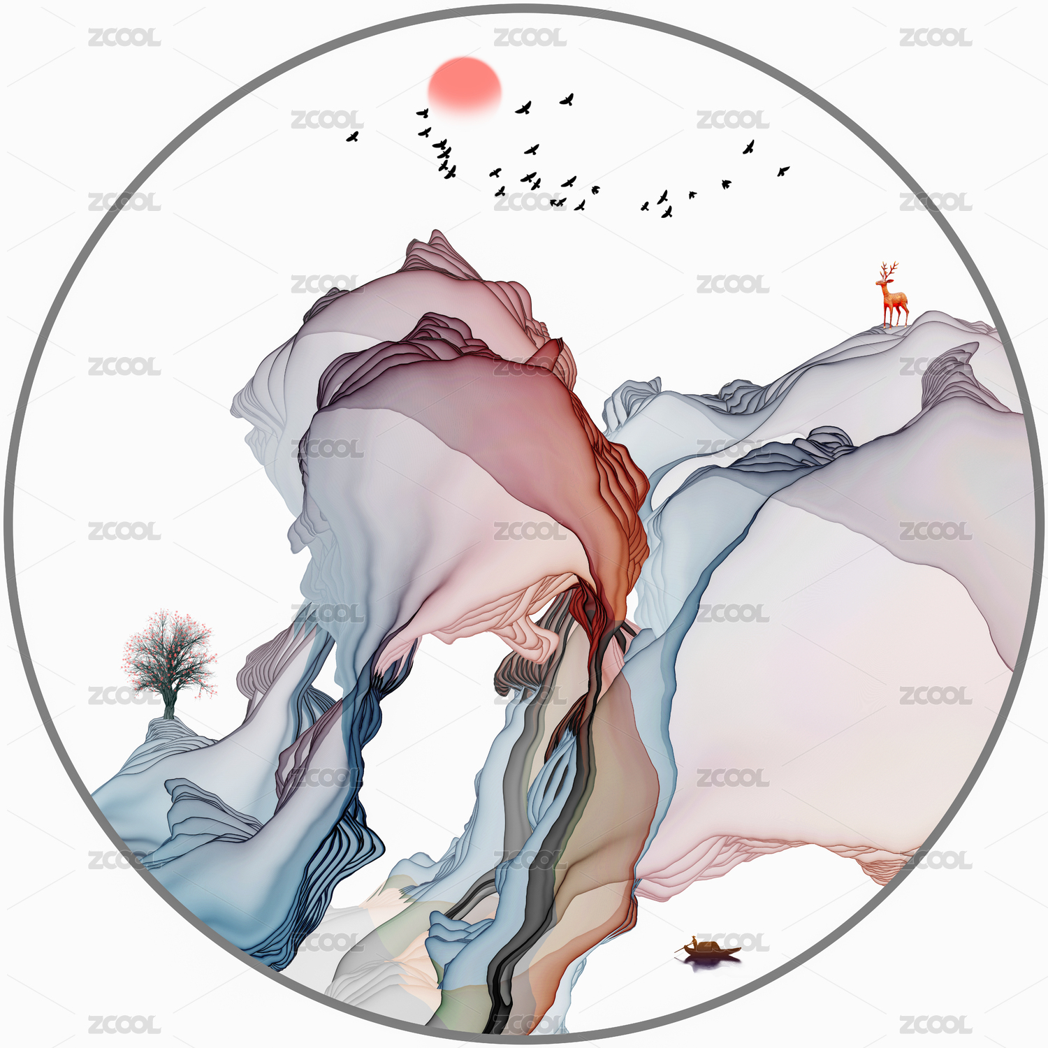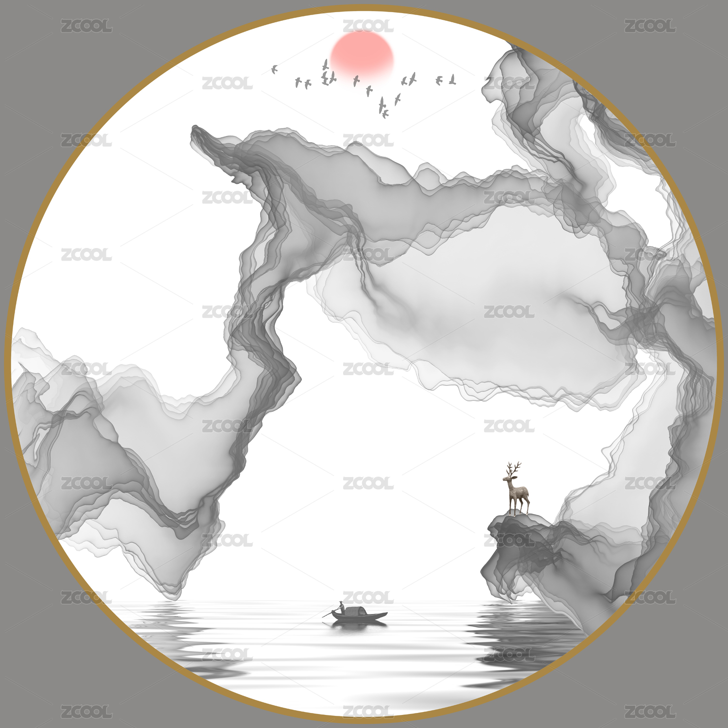圆形水墨山水装饰画