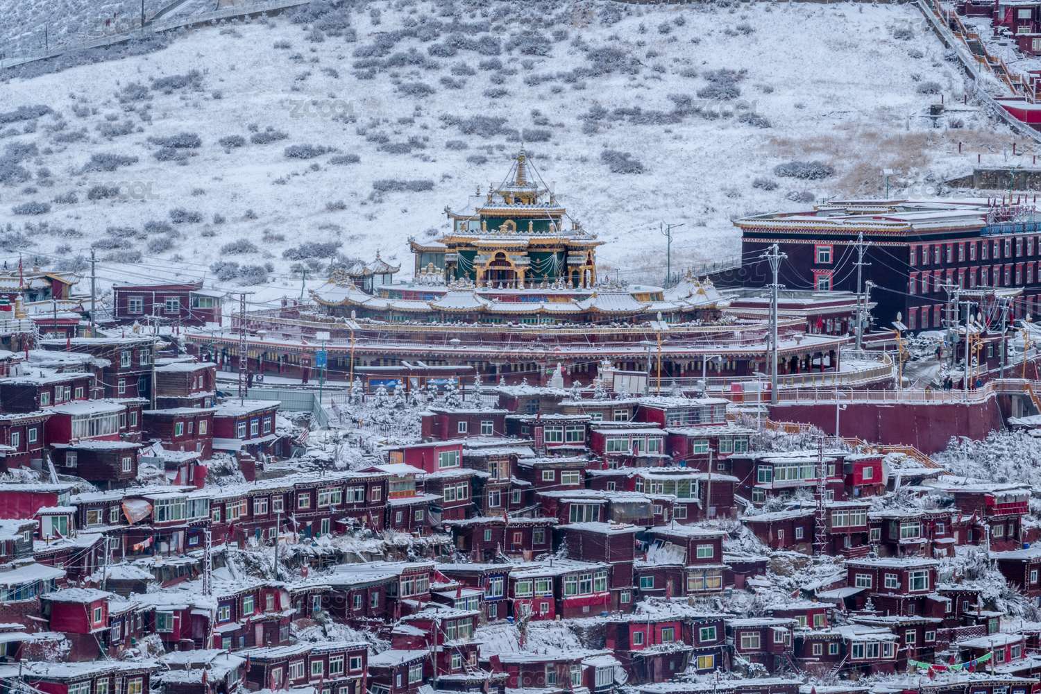 中国四川甘孜色达五明佛学院坛城清晨的雪景