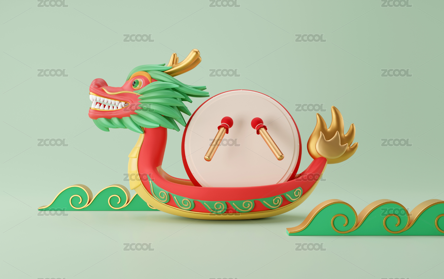 中国传统节日端午节3D载大鼓的赛龙舟船