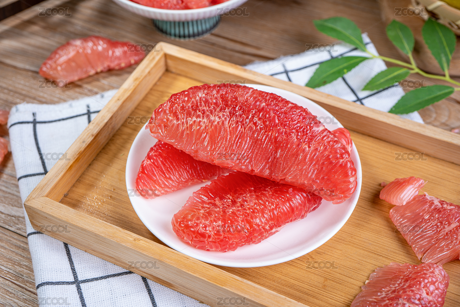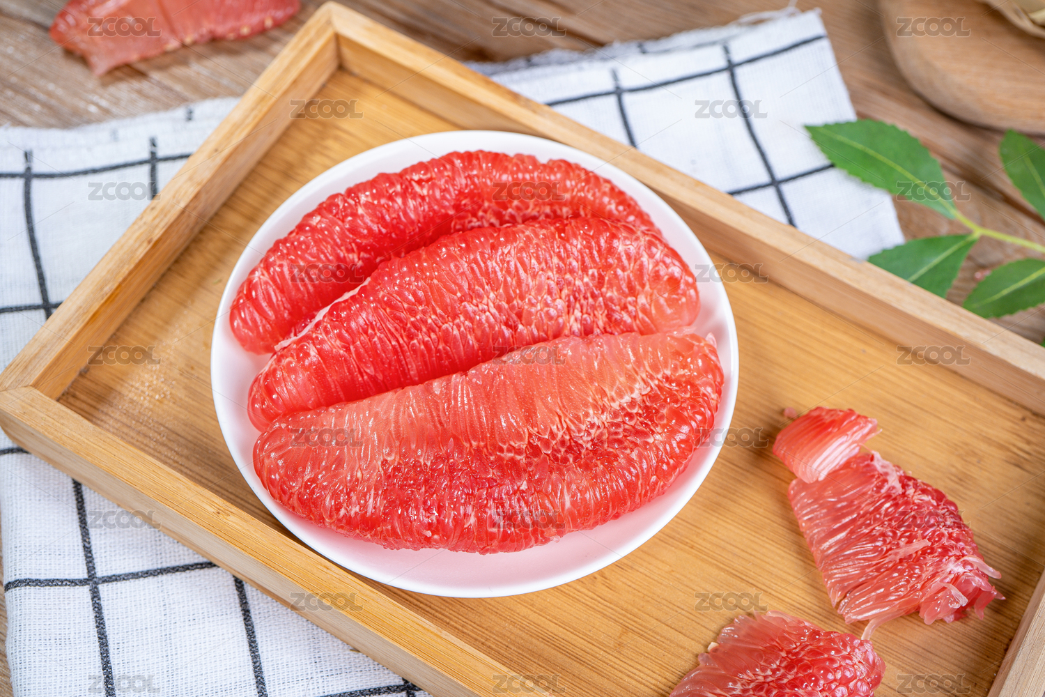 木垫子上放着一盘剥开的三红蜜柚果肉