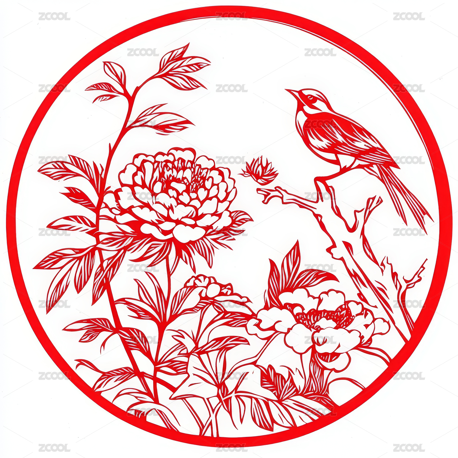 鸟牡丹剪纸窗花年画圆形中国风春节印刷打印