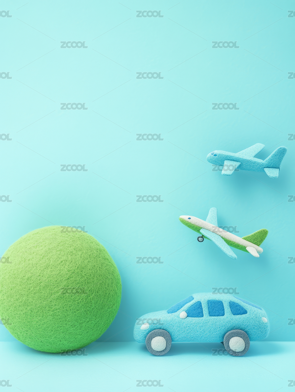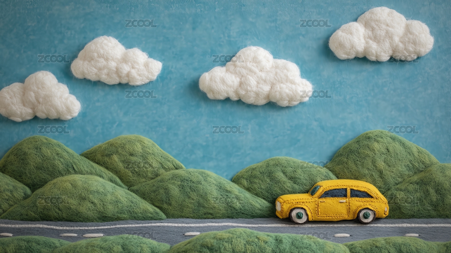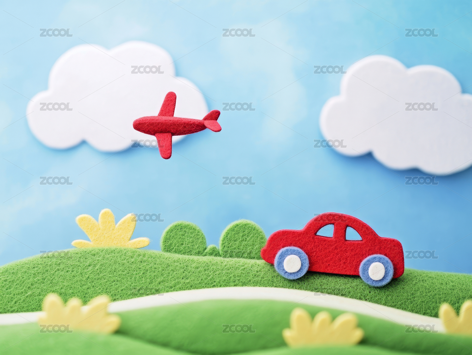 草地,汽车,毛毡,飞机,出行,旅游,卡通,中国旅游日,蓝天,白云