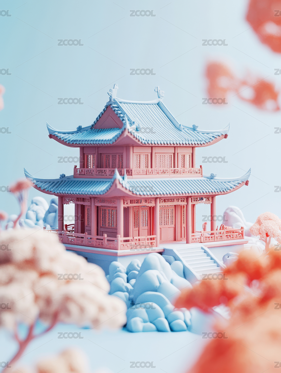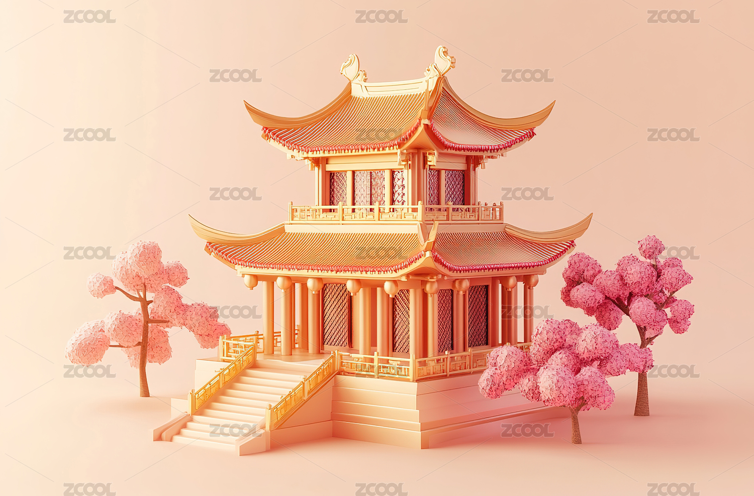 粉色系中式建筑模型
