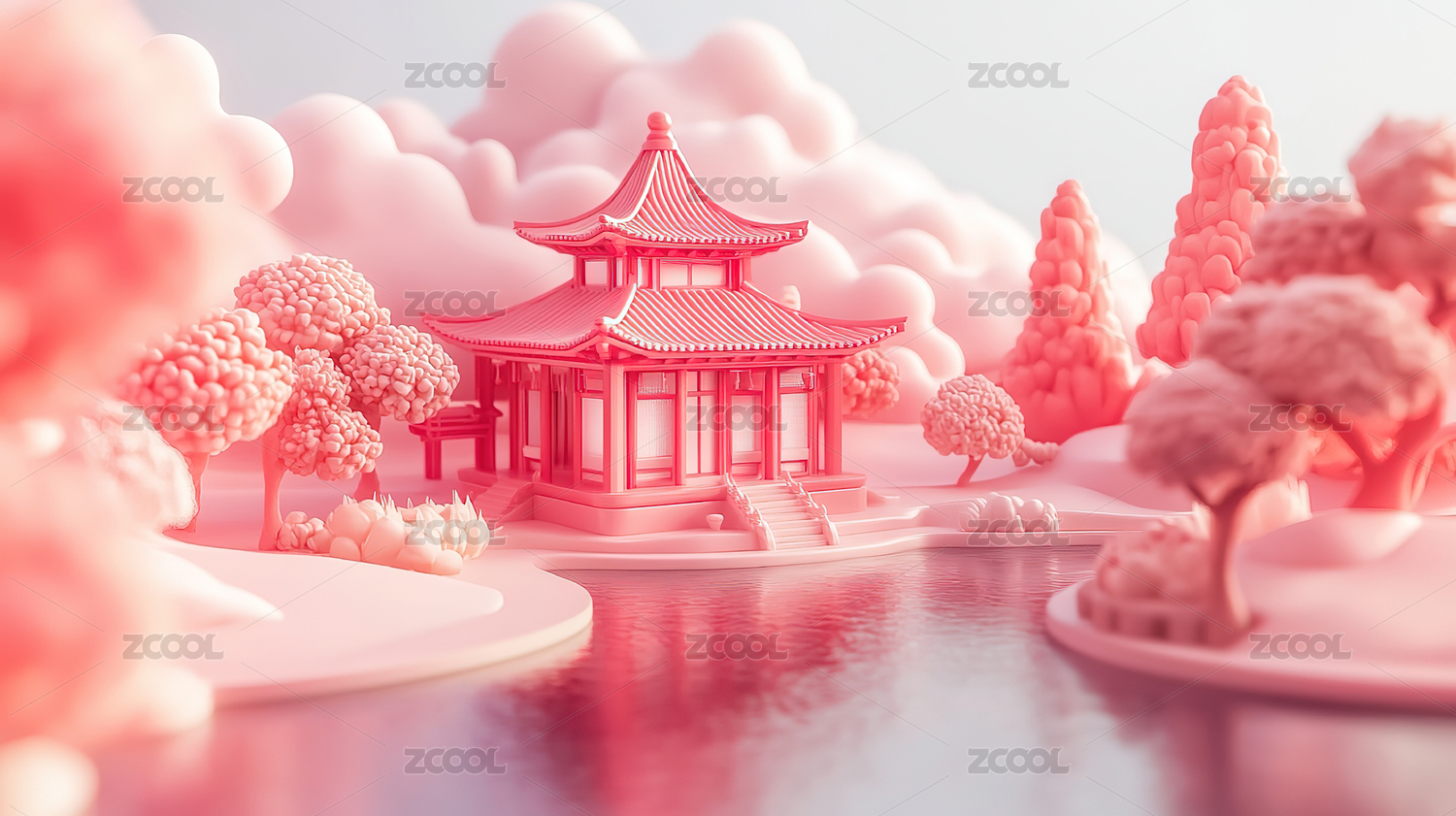 粉色,花,古建筑,中国风,3D,春节,建筑,古代,场景,插画